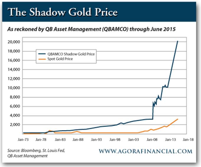QB還給出了關(guān)于影子金價(SGP)的圖表,用了布雷頓森林體系(Bretton Woods)的計算方法,計算美元兌黃金的匯率,假設(shè)美聯(lián)儲每月印美元850億,那么到2015年6月,這個影子金價價格會高得難以想象:每盎司20000美元。 如果影子金價和實際金價的比率不變,那么到2015年,金價將會飆漲到每盎司3400美元,高質(zhì)量金礦股票也會上漲幾百倍。