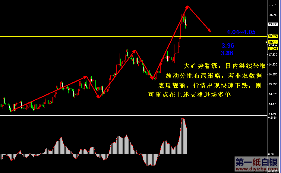 目前紙白銀價格是4.225元/克。昨日紙白銀仍維持調整,盤中出現快速下跌,向下小幅破位近期低點,雖大趨勢依舊看漲,但近期買盤力量持續減弱,建議投資者仍然采取分批布局的方式加倉多單,以拉開持倉均價為主,布局完畢后耐心持有等待。如下圖所示為紙白銀日線走勢圖,當前銀價大趨勢維持圖中紅色箭頭所示的上漲格局,在突破分水嶺3.92后,走勢進入強勢拉升,不過近期連續沖高回落可能暗示高位買盤力量的獲利了結,銀價需通過回踩支撐的方式再度蓄力(下方強支撐在4.04~4.05、3.96、3.86幾線)。目前走勢雖處于高位震蕩之中,但日內即將公布的非農數據將左右銀價超短線漲跌(并不影響中線),超短線投資者可依據非農數據決定買賣方向,但波段及中線投資者仍以回落分批做多為主。綜合分析,晚間非農數據將左右超短線走勢無疑,目前超短線形態回落可能性大于上漲可能性,但中線及波段走勢多頭完全占優。因此,并不排除晚間非農表現強勁后,銀價繼續回踩的可能性,但回踩幅度將難以扭轉趨勢,后市行情經歷調整后有望繼續拉升。投資者可根據個人倉位和操作偏好,決定晚間是進行短線操作還是進行波段布局,亦或采取先短線后波動布局的方式均可。今日晚間20.30即將公布非農數據,針對此次技術面與非農數據消息面,第一紙白銀繼續總結4種非農做單策略,僅供投資者參考: 今日依然可采取4種策略:1.消息結合技術面,2.提前掛單法,3. 回歸中線法,4.純技術面操作。 失業率前值4.7%,預期4.8%,實際值待定 1.消息結合技術面: 從當前技術面來看,紙白銀調整尚未完全結束,銀價仍有繼續通過回踩或震蕩的方式蓄力,目前走勢更加偏向于繼續調整。消息面上月非農表現疲軟,僅有3.8萬人,屬于歷史低點,本月非農小于3.8的可能極低,且昨日公布的小非農ADP為17.2,暗示非農在預期的18萬附近波動概率較大,基本面偏向于數據走強小幅利空銀價。在數據未公布之前,僅僅通過技術面走向和消息面可能波動來推測,日內銀價仍然存在繼續調整的可能性,若消息面利空,銀價可能朝著支撐4.04~4.05附近靠攏。但大趨勢看多的背景下,行情回落空間恐不大。 a.非農數據小于3.8萬人屬于大幅利多紙白銀,若出現此種情況,則投資者毫不猶豫在數據公布后追多進場,短線疲軟的非農數據有望提前結束調整,令市場再度獲得極大的買盤力量。結合當前技術面來看,今日若非農數據大幅利多,銀價將再度考驗4.43附近的壓力,若能完全站上該點位,后市將測試中線高點4.75附近。 b.非農數據大于18萬人,數據好于前值和預期,若再度回歸到20萬人以上,屬于較大幅度利空,此種情況銀價將繼續調整概率極大,目前技術面尚未完成多頭蓄力,加之消息面利空,預計銀價有望向下繼續回踩支撐位。結合當前技術面來看,今日若非農數據大幅利空,銀價將考驗日線支撐4.04~4.05、3.96兩線的可能性較高,其中4.04~4.05是主要的支撐位。短線投資者可在數據利空后先空后多,中線投資者則采取分批布局多單,等待回落支撐4.04~4.05、3.96、3.92、3.86幾線重點布局。 c.非農數據大于3.8萬人小于18萬人,數據好于前值,卻差于之前的平均水平和此次預期,嚴格意義上來講屬于先空后多的消息預期。市場可能向下釋放一輪空頭力量,但下跌幅度預計不大,而后銀價受到大趨勢看漲的影響仍有可能觸底反彈,但最終維持震蕩收盤的可能性較大。此種情況,不排除整體走勢并未多大波動變化,建議投資者放棄做空,以回落分批布局多單抓大趨勢為主。今日若數據小幅利空,銀價可能先下跌回落,而后反彈震蕩,最終波幅較小,此種情況建議逢低分批買入多單,放棄做空。 上述3條策略針對不同非農數據而應對,由于當前超短線仍有調整需求,但大趨勢看漲無疑,且未來上漲空間遠遠大于因非農利空而回調的空間。投資者需根據個人情況決定操作主思路,波段及中線投資者以逢低加倉多單為主,短線投資者以晚間數據波動方向快進快出為主,而后順應主趨勢布局多單。 2.提前掛單法(非農前掛單,非農后不掛單): 由于非農數據公布后市場波動劇烈,此時下單未必是最佳點位,且往往追到半空中的情況甚多,因此激進者亦可嘗試部分倉位提前掛單。根據目前技術形態來看,今日非農利多或利空后行情可能按照數據公布方向波動一段時間,而后才有望順應主趨勢出現企穩。因此,預計消息面將主導前半段行情波動,技術面將主導后半段行情波動。對于超短線投資者可選擇提前在重要支撐阻力掛單,而中線投資者放棄此策略。超短線白天可在阻力4.34附近掛空單,在支撐4.04~4.05附近掛多單,晚間消息公布后,若未掛進空單,則立即撤銷此單,多單可留(大趨勢看漲)。 3.回歸中線法: 今日白天行情若維持震蕩走勢,則投資者可采取回歸法則操作,若晚間數據公布前5~10分鐘內價格回歸至日內震蕩區間中間點位附近,則晚間價格突破區間后可順勢追單。 方法:非農公布前,若價格處于4.2~4.3元之間震蕩(假設情況,為橫盤震蕩走勢即可),晚間非農公布前5~10分鐘,價格回歸至中線點位4.25元附近,若數據公布后,價格一舉跌破4.2元向下兩分或突破4.3元向上2分,可順勢追單。(此種情況可在數據公布前5分鐘掛破位追單,必須滿足銀價回歸中間點位的條件,不滿足則不能用) 此種方法無需關注消息面,但需嚴格滿足所謂的回歸中線才可操作,配合技術面準確率較高。 滿足條件1:日內行情必須維持震蕩,不