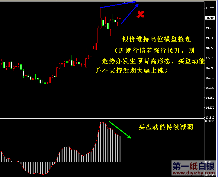 目前紙白銀價格是4.372元/克。昨日紙白銀繼續保持高位震蕩走勢,雖日線收陽,但短期買盤力量依舊不足,預計本周內行情暫時缺乏大幅拉升的條件,投資者在布局完畢多單后繼續保持觀望。如下圖所示為紙白銀日線周期走勢圖,近期銀價雖始終在高位震蕩整理,但買盤動能卻在持續減弱,如圖中綠色箭頭所示,在昨日行情觸底收陽的背景下,最終動能指標仍然維持向著零軸附近靠攏的走勢,顯示當前市場并無充足且持續的多頭力量支撐行情再度拉升。對接下來走勢作出逆向假設,如圖中藍色箭頭所示,假設行情在近期強行上漲,則由于動能指標MACD仍然處于收量狀態,此時將極容易發生所謂的頂背離形態(價格創出新高,但買盤動能未能創出新高),而頂背離形態是常見的見頂形態之一。因此,銀價此時若能維持高位震蕩或出現回落,則對于中長線看多者是最大的利好,反而若銀價出現拉升后再回落,則是較為危險的信號。基于此,近期走勢仍不可大幅追多,應在回調過程中分批介入多單,后市隨著買盤力量持續減弱,我們將尋求更佳的買入機會,其中4.2下方仍然是良好的多單加倉點位,投資者可重點關注4.17、4.12、4.04~4.05、3.96幾線,可在上述點位著重加倉。綜合分析,銀價調整修復的方式仍然以兩種形態為主,其一是通過時間換取空間的方式進行修復,此種情況價格大多維持橫盤整理,直至最終動能指標釋放完畢空頭力量并重新積蓄買盤動能;其二則是通過空間快速回調的方式修復,此種情況將盡最快時間,最大空間進行空頭力量的釋放,而后在低位支撐再度獲得買盤動能。目前來看,銀價可能維持第一種高位震蕩修復為主,此種情況或消耗較長時間,建議投資者保持充足耐心。(注: 由于紙白銀價格是國際銀價換算而來,而換算過程中涉及到人民幣對美元匯率的變化,即使在國際銀價不變化的情況下,如果人民幣貶值或升值,也會導致紙白銀價 格出現變動。因此,我們的分析只采用最新的國際銀價對應的人民幣白銀價格,如與過去分析價格有出入, 投資者應知曉其原因。)