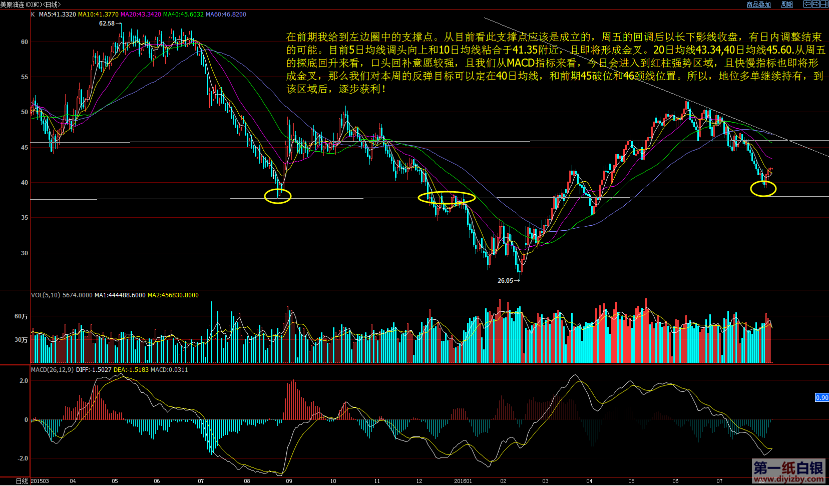 再來看看原油走勢,周五原油價格出現回調,目前給出圖中黃色圈所示的支撐,周五的回調靠近支撐附近,說明該點位是成立的,今日行情有回調結束的可能性。目前5日均線掉頭向上和10日均線粘合于41.35附近,即將形成金叉。20日均線43.34,40日均線45.60。從周五的探底回升行情來看,空頭回補意愿較強,且MACD今日會進入到紅柱強勢區域,且快慢指標也將形成僅差,本周的反彈目標可以定在40日均線,和前期45破位和46頸線位置。所以,低位多單繼續持有,到該區域后逐步獲利。