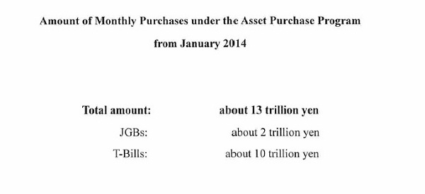 -開放式購債: 日本央行將通過零利率政策和金融資產購買來達到激進寬松目標。在完成當前的資產購買計劃后,自2014年1月起,日本央行將每月購買約13萬億日元金融資產,其中包括2萬億日元日本國債(JGB),不設定終止日期。在實施這些措施后,日本央行資產購買項目的總規模將在2014年增加約10萬億元,并預計將在此后維持這一規模。