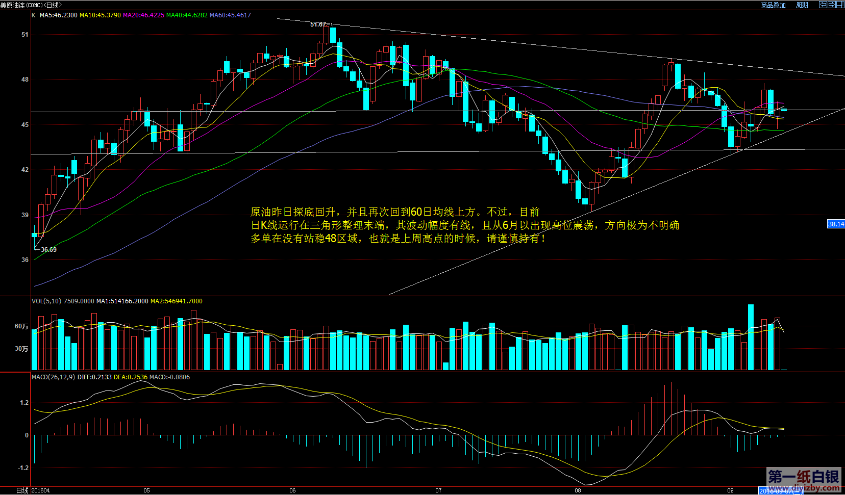 昨日白銀價格以T字十字星收盤,而最低觸及的正是下圖所示的三角形支撐線位置,今日白銀價格如果能夠再以中陽線收盤,最好沖擊19.5~19.5附近,則 將確認(rèn)多頭力量復(fù)蘇,那么可以繼續(xù)持有多單,后市有望開啟新一輪上漲;反之,今日如果銀價以小陰線收盤,那么走勢在觸底反彈后多頭力量不足,后市需謹(jǐn)防繼 續(xù)回落,多單需做好止損。 如下圖所示當(dāng)前銀價處于小三角形范圍內(nèi)波動,昨日雖然回踩了支撐反彈,但目前并未突破三角形阻力,日內(nèi)關(guān)注收盤情況,今日強(qiáng)勢則后市強(qiáng)勢,今日弱勢則需謹(jǐn)防回調(diào)繼續(xù)。 日內(nèi)策略,暫時持有多單觀望。 再來看看原油走勢,昨日原油探底回升,并且再次回到了60日均線上方。不過,目前原油的日K線運(yùn)行在三角形末端,其波動幅度預(yù)計有限,且從6月以來行情連續(xù)出現(xiàn)高位震蕩,方向極為不明確。多單在沒有站穩(wěn)48區(qū)域之前應(yīng)該謹(jǐn)慎持有。