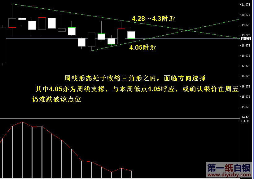 基本面方面:昨日市場公布了一系列重磅的美國經濟數據,其中GDP數據和初請失業金數據表現強勁,但成屋銷售意外疲軟,受到GDP數據靚麗的影響,市場對于美國經濟恢復預期較為樂觀,增加了12月美聯儲加息預期,打壓貴金屬承壓下行。具體數據顯示,美國第二季度實際GDP年化季率終值錄得1.4%,高于預期的1.3%,修正值為1.1%。美國一季度GDP增速僅為0.8%;美國9月24日當周初請失業金人數為25.4萬人,連續82周處于30萬關口下方,連續周期創1970年來最長;美國8月NAR季調后成屋簽約銷售較上月下跌2.4%,至108.5,預估為持平,7月為增長1.2%。目前市場關注焦點為接下來公布的非農數據,在此之前,市場較為謹慎,也令金銀多空力量保持觀望,行情走勢清淡。今日建議投資者關注晚間20:30美國8月個人消費支出和8月個人收入,日內消息面清淡,多以技術面為主。 提醒:以周線走勢形態來看,當前銀價正處于收縮三角形范圍內波動,隨著時間推移,銀價的波動空間會越來越小,最終不得不面臨方向選擇。如下圖所示為紙白銀周線走勢圖,圖中綠線所示便為當前銀價所處的收縮三角形范圍,本周銀價在三角形內的支撐為4.05,其與本周低點4.05呼應,暗示周五銀價或難以跌破該點位;本周阻力為4.28~4.3,與日線阻力4.3呼應,本周行情將難以突破該點位。