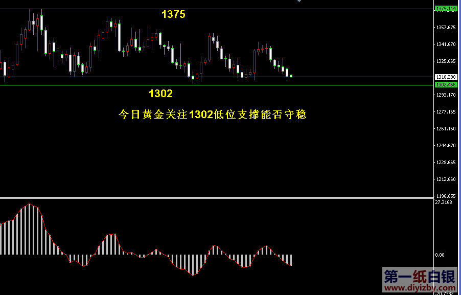 基本面方面:昨日市場消息清淡,中國市場仍然處于十一假期休市之中,白天行情波動并不大。但晚間良好的美國經(jīng)濟(jì)數(shù)據(jù)令金銀價格繼續(xù)承壓,其中美國Markit制造業(yè)PMI和ISM制造業(yè)指數(shù)的表現(xiàn)都好于預(yù)期,在數(shù)據(jù)公布后,美聯(lián)儲年內(nèi)加息預(yù)期增加,由此前的52%驟升至62%,充分說明了美國經(jīng)濟(jì)對于美聯(lián)儲加息預(yù)期的主導(dǎo)性。具體數(shù)據(jù)顯示,美國9月Markit制造業(yè)PMI終值51.5,預(yù)期51.4,初值51.4;美國9月ISM制造業(yè)指數(shù)51.5,預(yù)期50.3,前值49.4。另外,前期支撐避險情緒反彈的重要消息“德銀危機(jī)”逐漸緩解,市場上有關(guān)德銀試圖與美國司法部協(xié)商大幅降低罰款金額的消息,令風(fēng)險偏好有所改善,也成為打壓銀價回落的一部分因素。不過,由于本周五美國將公布重要的非農(nóng)數(shù)據(jù),因此當(dāng)前市場仍然較為謹(jǐn)慎,金銀處于區(qū)間內(nèi)震蕩,預(yù)計在非農(nóng)指引下才有望選擇方向。今日市場消息清淡,投資者可關(guān)注白天11:30澳洲聯(lián)儲公布利率決議及政策聲明,晚間關(guān)注20:05美聯(lián)儲里奇蒙德聯(lián)儲主席萊克講話。 提醒:近期黃金的走勢亦表現(xiàn)疲軟,但其仍然領(lǐng)先銀價波動,投資者可參考金價走勢形態(tài),來提前判斷銀價可能波動方向。如下圖所示為黃金日線走勢圖,當(dāng)前黃金形態(tài)與白銀走勢一致,亦處于大區(qū)間范圍內(nèi)震蕩。不過金價較銀價更加弱勢,目前正逐漸靠近區(qū)間低點(diǎn)1302附近,日內(nèi)投資者可首先關(guān)注黃金在靠近區(qū)間低點(diǎn)1302附近的反彈情況,若其提前跌破1302,則或暗示銀價即將破位3.93;反之,若能守穩(wěn)上述點(diǎn)位出現(xiàn)反彈,則銀價亦有望守住3.93。