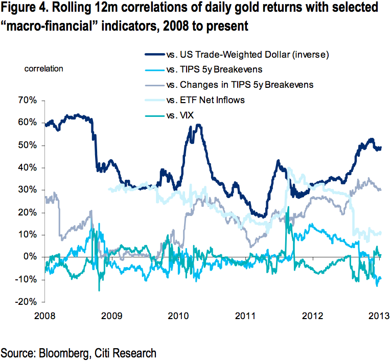 花旗表示,這份預期主要的依據是目前驅動黃金價格走勢的最關鍵因素:美元。“美元匯率目前對于黃金價格的驅動作用甚至超過了傳統意義上驅動黃金價格變動的因素。” 下圖顯示,美元走弱和黃金價格的相關性(深藍色線條),同時還顯示出目前金價與VIX波動性指數變動幾乎沒有相關性了,與流向黃金ETF的資金流等指標的相關性都在降低。通脹預期對于金價走勢有一定的相關性,但遠不及美元與金價的相關性高: