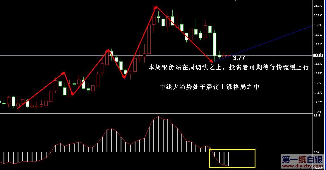 目前紙白銀價(jià)格是3.793元/克。上周五紙白銀收盤十字星,整體走勢仍然偏弱,目前銀價(jià)處于區(qū)間3.65~3.85范圍內(nèi)震蕩接近3周,多空雙方均表現(xiàn)疲軟,暗示市場觀望情緒濃厚,預(yù)計(jì)后市銀價(jià)一旦突破區(qū)間后其波動(dòng)幅度將較大,穩(wěn)健者近期建議保持觀望,等待區(qū)間突破后可嘗試跟進(jìn);激進(jìn)者在區(qū)間內(nèi)持有多單,嚴(yán)格止損3.65下方。如下圖所示為紙白銀周線走勢圖,由于短線銀價(jià)持續(xù)表現(xiàn)為震蕩,暫無任何參考意義,投資者可將觀察點(diǎn)集中于更大周期的中線走勢形態(tài)。圖中紅色箭頭顯示銀價(jià)中長線走勢仍然處于“進(jìn)三退二”的震蕩上行步伐之中,當(dāng)前行情回踩的3.65恰恰為“退二”后的強(qiáng)支撐點(diǎn)位,若此處能完成企穩(wěn)止跌,則后市銀價(jià)將有較大概率再度順應(yīng)紅色箭頭開始新一輪“進(jìn)三”行情;反之,若無法企穩(wěn)于3.65,則走勢將繼續(xù)考驗(yàn)下方支撐,一旦后市跌破3.37前浪上漲低點(diǎn),則當(dāng)前上漲形態(tài)將被破壞。目前銀價(jià)所處第一震蕩區(qū)間3.65~3.85的突破方向至關(guān)重要,這關(guān)系到后市中線走勢能否重新開啟新一輪上漲。正如圖中所示,一旦中線開啟新的上漲,則其空間極大,將有望突破前浪3.37~4.5的漲幅。因此,目前穩(wěn)健者完全可以保持觀望,等待突破后再分批布局多單仍有較大利潤。目前中線形態(tài)略微偏向于多頭占優(yōu),其中如藍(lán)線所示,本周銀價(jià)開盤后站在了周切線之上,其支撐位于3.77附近,周內(nèi)行情仍然有再度沖擊3.85附近阻力的希望。另外,黃色框所示動(dòng)能指標(biāo)顯示開始收量,暗示中線下跌動(dòng)能或逐漸減弱,對(duì)銀價(jià)反彈啟動(dòng)積極作用。綜合分析,盡管種種跡象表明銀價(jià)在3.65上方已經(jīng)缺乏空頭力量,但行情遲遲未能出現(xiàn)較大反彈,同樣也說明了當(dāng)前市場的多頭動(dòng)能疲軟。基于此,投資者還需更多的耐心等待,與其猜測多空最終誰能占優(yōu),不如等待區(qū)間突破后順勢跟進(jìn)。由于目前點(diǎn)位處于區(qū)間內(nèi)偏高,不建議投資者再進(jìn)場做多,可等待突破后嘗試追單和回落加倉多單,前期已經(jīng)進(jìn)場多單者可做好止損繼續(xù)持有。(注: 由于紙白銀價(jià)格是國際銀價(jià)換算而來,而換算過程中涉及到人民幣對(duì)美元匯率的變化,即使在國際銀價(jià)不變化的情況下,如果人民幣貶值或升值,也會(huì)導(dǎo)致紙白銀價(jià) 格出現(xiàn)變動(dòng)。因此,我們的分析只采用最新的國際銀價(jià)對(duì)應(yīng)的人民幣白銀價(jià)格,如與過去分析價(jià)格有出入, 投資者應(yīng)知曉其原因。)
