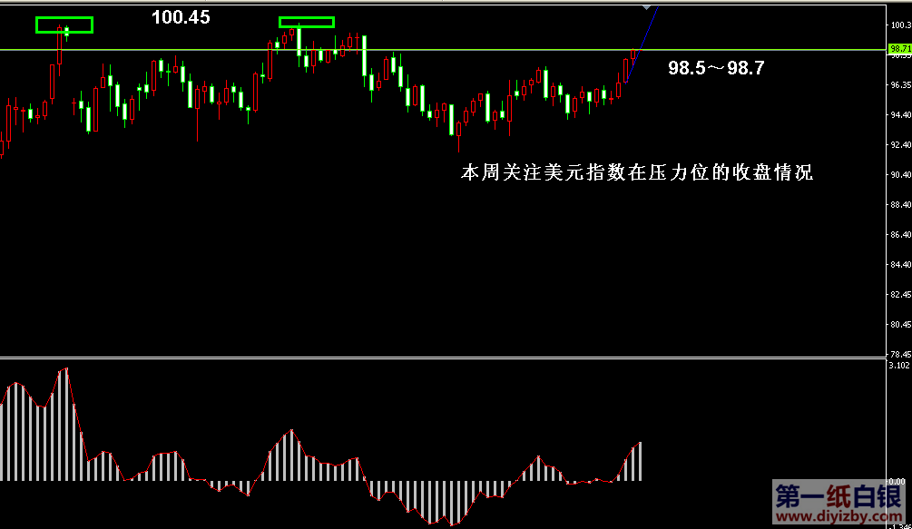 基本面方面:由于上周整體美國經(jīng)濟(jì)數(shù)據(jù)表現(xiàn)強(qiáng)勁,且美聯(lián)儲(chǔ)官員繼續(xù)釋放年內(nèi)加息的預(yù)期,當(dāng)前市場關(guān)于美聯(lián)儲(chǔ)12月升息預(yù)期已經(jīng)從非農(nóng)后的50%,逐漸攀升至67.6%,成為令貴金屬承壓的關(guān)鍵因素。不過,經(jīng)歷了持續(xù)的下跌行情后,當(dāng)前關(guān)于美聯(lián)儲(chǔ)年底加息的預(yù)期已經(jīng)被銀價(jià)消化,后市除非有更進(jìn)一步利空消息,否則行情再度大跌的市場情緒并不充足。本周市場調(diào)查顯示48%投資者看多貴金屬上漲,24%看空貴金屬下跌,28%仍然預(yù)計(jì)貴金屬將維持震蕩走勢。周內(nèi)消息面相對(duì)上周清淡,投資者可繼續(xù)關(guān)注美聯(lián)儲(chǔ)官員的講話,以及周五晚間公布的美國第三季度GDP數(shù)據(jù),該數(shù)據(jù)預(yù)計(jì)對(duì)市場影響力較大。今日市場消息較為清淡,晚間則主要關(guān)注晚間21:05圣路易斯聯(lián)儲(chǔ)主席布拉德就美國經(jīng)濟(jì)和貨幣政策發(fā)表的講話。 提醒:近期我們將目光主要集中于美元指數(shù)的表現(xiàn)中,上周美指繼續(xù)拉升,觸及98.5阻力后未見回落,但指標(biāo)偏離信號(hào)仍然存在,本周開盤后美指受到了周切線98.7的壓制,周內(nèi)投資者繼續(xù)關(guān)注其在該阻力附近是否出現(xiàn)回落,一旦美指于98.5附近出現(xiàn)回調(diào),則由于該點(diǎn)位屬于中線壓制,則后市其回調(diào)幅度亦較大;反之,若美元指數(shù)本周站穩(wěn)98.5,則后市便有沖擊雙頂100.45的機(jī)會(huì)。美元指數(shù)的走勢,可以從側(cè)面反映未來金銀價(jià)格的反向走勢。如下圖所示為美元指數(shù)周線走勢圖,本周投資者需關(guān)注美指在阻力98.5~98.7的周線收盤情況,站穩(wěn)或跌破將很大程度暗示美指下一步中期波動(dòng)方向。