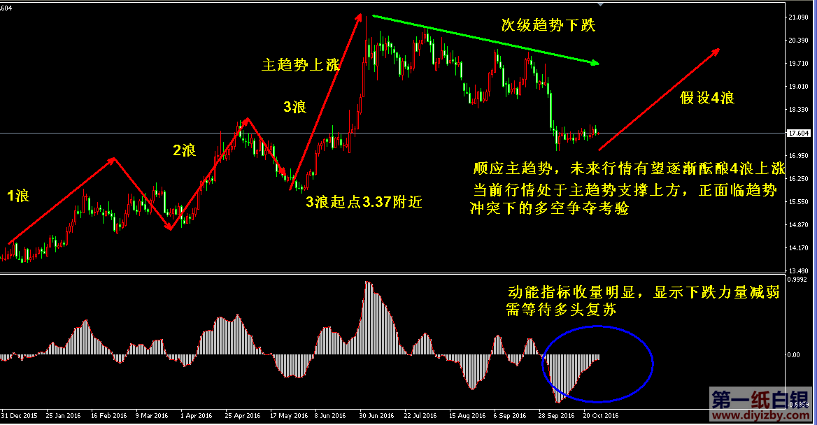 技術僅僅是基于概率論和統計學的一種綜合分析手段,絕非預測。所以技術分析是在考慮做好止損的情況下去博取大概率事件,投資不可過于迷信技術分析。(短線操作請一定做好止損,一旦被損,代表分析師基于概率和統計的技術分析不適用于當前行情) 1、紙白銀短線看點位,中線做方向。 2、以上所有價格為工商銀行買入價,即紙白銀低價。進倉點位要再加0.04,出倉則不要。 3、第一紙白銀給出的所有建議僅供投資者參考,不作為下單絕對依據,切勿過于依賴。 4、北京時間08:51發布此文章。 5、上一交易日白銀價格分析情況:(10月26日)紙白銀即將突破阻力 買盤力量逐漸復蘇