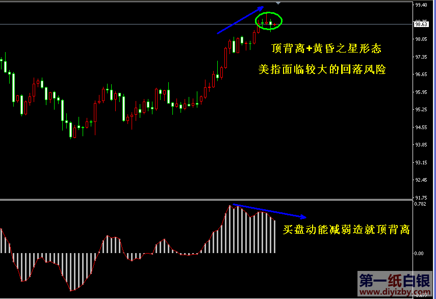 基本面方面:昨日美國公布的經濟數據好壞參半,但整體仍然表現良好,繼續支撐美聯儲年內升息的預期。具體數據顯示,美國10月Markit服務業PMI初值54.8,為2015年11月以來最高,預期52.5,前值52.3;美國9月新屋銷售59.3萬,預期60萬,前值57.5萬;月率3.1%,預期-1.5%,前值-8.6%。另外,昨日美國費城聯儲主席哈克發表升息言論。哈克稱,市場低估了美聯儲利率正常化進程,利率在零附近徘徊太久有風險。他贊成在9月份的會議上加息25基點。在11月美聯儲決議和美國大選來臨之前,目前市場逐漸開始維持謹慎態度,投資者無論多空均保持觀望的意圖明顯,似乎在等待美國大選落幕和11月決議出爐后的更多方向指引。今日投資者可關注晚間20:30公布的美國9月耐用品訂單月率、美國10月22日當周初請失業金人數、22:00美國9月成屋簽約銷售指數數據。 提醒:也如我們近期所預測一樣,美元指數連續沖高后已經有見頂跡象。近兩日美指分別收盤十字星和陰線,組合形成了“黃昏之星”形態,暗示美元指數見頂可能到來,一旦美指下跌,則黃金白銀便有正當的理由開始上漲,對于后市金銀企穩具有戰略性的意義。如下圖所示為美元指數日線走勢圖,近期美指在沖高后開始遇阻,該阻力位(98.5上下)也是行情中線壓制,而恰恰在壓制點位附近,美元出現了頂背離形態和黃昏之星的看跌形態,種種跡象表現,美元當前面臨極為嚴重的回落風險,投資者近期仍將繼續關注美元走勢,若其出現較大跌幅,將確認頂部形態,屆時在低位買入金銀將有較大盈利的希望。(美元指數與金銀走勢波動呈現70%左右的負相關性)