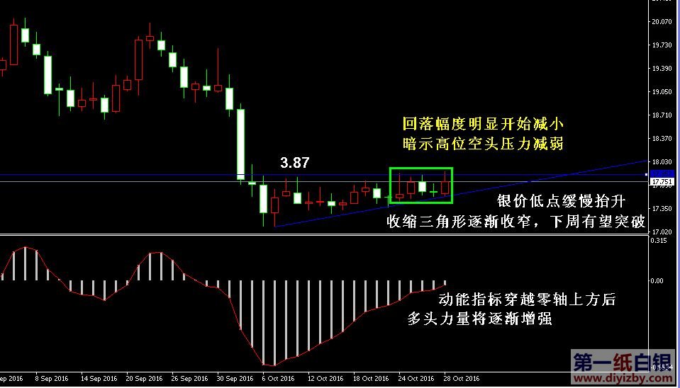 目前紙白銀價格是3.853元/克。本周紙白銀雖仍維持震蕩區間內波動,但較上周走勢明顯轉強,銀價曾多次沖擊震蕩區間高點3.87,從最初的大幅沖高回落,到周五銀價小幅回落,顯示行情在高位的空頭壓力逐漸減弱,預計后市行情向上突破區間的概率較大。如下圖所示為紙白銀日線走勢圖,圖中藍線顯示當前銀價正處于收縮三角形范圍內波動,但隨著時間推移,該三角形正逐漸收窄,加之當前行情低點正緩慢抬升,預計下周走勢將有較大概率向上突破。我們以圖中綠色框標注了本周銀價的5日走勢,周一行情沖高后出現了大幅回落,日線形成長上影線的小陽線,暗示銀價近期首次遇阻后上方空頭壓力明顯;周三銀價再次沖高,無奈錄得中陰線,顯示阻力位空頭壓力仍然較重,但回落幅度較周一略有好轉(低點較周一抬升);周五銀價三次沖擊阻力,雖再度沖高回落,但形態上看,其回落幅度較小,日線收盤中陽線,暗示高位做空力量已然不足。從動能指標MACD走勢形態來看,該指標下周亦有向上穿越零軸的意圖,一旦其突破零軸,則多頭動能仍有繼續放量的機會,屆時伴隨本銀價向上突破3.87區間高點,多頭力量將有望迎來一輪較大釋放,行情亦有希望向上出現一輪快速反彈。綜合分析,本周紙白銀正逐漸走入轉強格局,行情依舊沿著200日均線緩慢上行,雖然未能向上突破關鍵分水嶺,但向下回落的力度更加薄弱。可以認為當前行情在區間內正一點點消耗著僅有的空頭力量,并逐步蓄力買盤動能,當其向上突破3.87并完全站上該點位后,多頭將進一步增強,屆時銀價便有望繼續向上沖擊下一道強阻力3.98附近。以上建議僅供參考, 不作為下單依據。