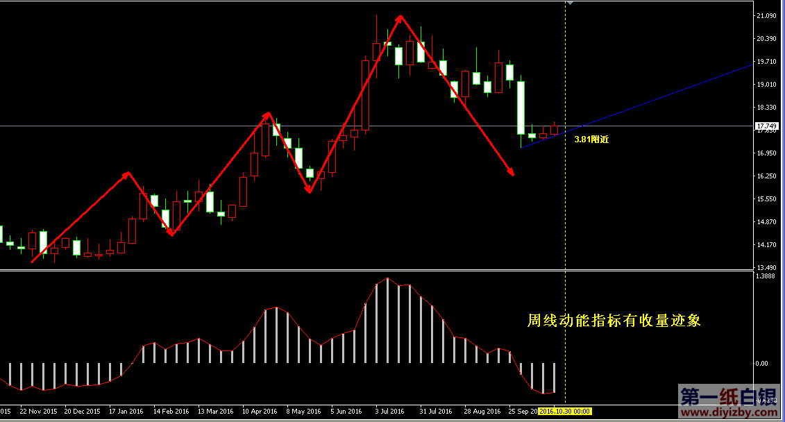基本面分析:本周的美國經濟數據繼續表現良好,成為打壓銀價弱勢的關鍵因素,尤其周五公布的美國第三季度GDP增長2.9%,創兩年來最高水平,預期增長2.6%,前值增長1.4%,該消息繼續支撐了年內美聯儲的升息預期。不過由于下周即將公布11月美聯儲決議,以及11月初的美國總統大選結果仍有疑問,在前期美元大幅上漲后,投資者選擇獲利離場,打壓美元回落,支撐金銀得以反彈。下周開始市場將逐步迎來諸多重磅消息,首先值得投資者關注的便是下周四凌晨公布的美聯儲11月利率決議,目前市場普遍預計此次決議美聯儲將維持利率不變,但可能從中捕捉更多關于未來美聯儲貨幣政策的蛛絲馬跡,對于行情波動產生影響,可以將此次決議視為一次前瞻指標。另外除了美聯儲決議外,下周還將迎來日本央行、英國央行以及澳洲聯儲利率決議,投資者亦可從非美貨幣政策方面觀察,從而評估全球整體貨幣政策預期,對于判斷貴金屬中長線具有極大幫助。由于11月8日美國總統大選也將塵埃落定,下周市場對于大選將更進一步清晰明朗,特朗普和希拉里就職預期也將影響貴金屬走勢,目前市場普遍認為特朗普上任將大幅利多貴金屬,下周投資者也許密切關注這一事件進展。此外下周的美國非農數據亦非常重要,可以說整周都是消息密集的一周。 下周紙白銀短線交易:短線行情仍然處于緩慢爬升階段,在銀價未突破區間3.67~3.87之前,我們暫無法完全確認多空最終方向選擇,但從目前走勢的蛛絲馬跡來預測,銀價向上突破區間的概率較大,激進者則可提前埋伏多單,等待行情確認突破后可開始加倉。而穩健者繼續保持觀望,在銀價突破并站上3.87后將確認多頭轉強,屆時伴隨動能指標的進一步放量,買盤力量有望得以爆發,行情預計短期迎來一輪有效的快速反彈行情,建議穩健者等待突破3.87后可開始分批加倉多單,目標看至3.98下一道阻力附近。 下周策略:前期多單保持持有,突破3.87后可嘗試輕倉追單,而后采取分批3~4分加倉的方式布局,目標看至3.98附近。 下周紙白銀中線交易:中長線仍然維持前期建議,當銀價處于區間3.67~3.87范圍內震蕩時,投資者應持有不超過7成的中線倉位,等待其突破3.87后可加倉一成,突破3.98后再加倉一成,未來突破中線下跌趨勢線后可將全部倉位跟進。由于中線走勢仍然處于上漲格局之中(不跌破3.37將保持趨勢不變),因此中線投資者繼續以布局多單為主,但中線演變過程較為緩慢,投資者恐需要更多的耐心。 下周紙白銀關注重點:美聯儲利率決議、美國非農數據、歐佩克會議、紙白銀技術面。 下周紙白銀多空震蕩預計: 多-空-震蕩=4:2:4 下周紙白銀重要支撐阻力: 阻力:3.87、3.98~3.99、4.04、4.14、4.2~4.21。 支撐:3.67附近、3.5~3.53附近。 下周提示:由于本周紙白銀收線較佳,下周行情仍將受到周切線支撐,在空頭壓力不強的基礎上,銀價繼續上行的可能性更進一步。如下圖所示為紙白銀周線走勢圖,連接近幾周低點得出一條周切線,如圖中藍線所示,下周該切線衍生點位在3.81附近,換言之,周內銀價站在3.81上方仍將繼續向上爬升,且受到周切線3.81的支撐。周內投資者可在該點位加倉多單,并以3.81能否守穩作為銀價整周強弱的判定標準。圖中紅色箭頭顯示當前中線趨勢正處于進三退二的上行浪之中,而當前銀價若能突破3.87,則有望宣布退二結束,開啟新一輪進三行情。