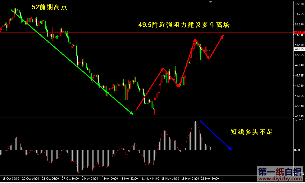 今日下方關鍵支撐3.6附近(關注美元16.3附近);今日上方關鍵阻力3.7(16.7美元)3.73(16.9美元)、3.81(17.25美元)、3.91(17.6美元)、3.97(18美元)、4.05(18.37美元)。 原油:昨日原油收盤十字星保持震蕩走勢,短線行情已經(jīng)顯示出多頭力量不足的跡象。如下圖所示為原油4小時周期走勢圖,從趨勢來看,前期52高點所引發(fā)的一輪回落如果堪稱是主趨勢,則近期行情連續(xù)反彈將受到過去下跌趨勢阻力的影響,而49.5正是該下跌的強壓位置。從短線動能形態(tài)來看,多頭力量近期震蕩中見到明顯的減弱跡象,暗示有部分多頭開始獲利離場,繼續(xù)上沖雖仍有小量空間,但遭遇強阻49.5附近恐面臨多頭集中獲利和空頭增強的情形。穩(wěn)健者近期建議前期多單在靠近49.5附近做分批離場,等待回落45.6附近及下方重新將多單接回,特別激進者可靠近49.5附近輕倉博短線空單,主趨勢仍然看漲,空單獲利即離場。