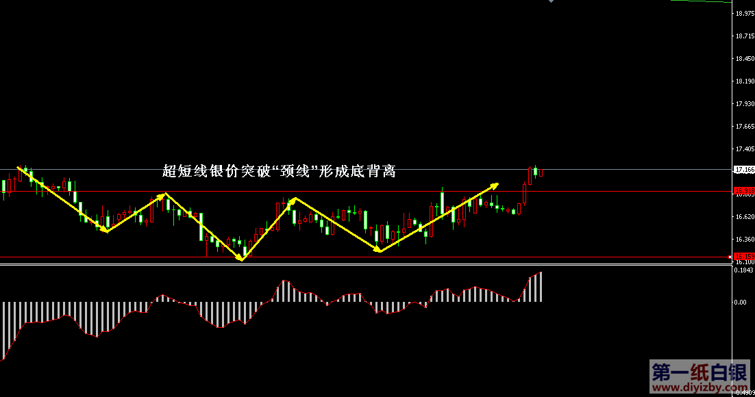 目前紙白銀價格是3.769/克。經歷了多日的震蕩盤整,銀價最終向上突破了強弱分水嶺3.73(16.9美元),由此暗示行情超短線圍繞3.58~3.6形成筑底的事實,且日線趨勢完成了“下跌--震蕩”的轉變,銀價未來一段時間將在“3.58~日線下跌趨勢線”所形成的大收縮三角形范圍內運行,由于近期走勢距離下一日線壓力位較遠,行情有望迎來短暫的連續反彈行情,下一目標將主要關注3.87~3.88(17.6美元)附近。如下圖所示為白銀日線走勢圖,參考日線大趨勢格局和近期行情向上突破強弱分水嶺3.73的情況,我們大致可得出如下結論:1.近期行情向上突破強弱分水嶺3.73(16.9美元)后,暗示超短線行情已經轉強,銀價有望圍繞3.58~3.6形成底部并迎來一輪連續性反彈走勢。如圖中黃色箭頭所示,此輪反彈走勢與前期下跌趨勢中的反彈行情形態較為相似,投資者下一步可重點關注3.87~3.88(17.6)、3.95(17.9)、4.05(18.3)幾線日線趨勢的壓力位,當未來銀價觸及上述點位后,正如圖中黃色和藍色箭頭交界處,投資者需謹防行情受到大趨勢阻力壓制而再度回落的風險,因此我們對超短線走勢的判斷是“先反彈,后回踩”;2.從近期日線的動能指標我們亦可看出相似點,昨日隨著銀價沖破3.73后,動能進入零軸上方開始有放量的跡象,說明多頭力量進一步增強,伴隨其持續放量,銀價將借助買盤支撐而考驗日線三大阻力3.87~3.88、3.95、4.05幾線的可能性較高,而后才將開始受到空頭強壓影響;3.由圖中的波浪形態我們還可得知,當前日線趨勢仍然處于下跌格局之中,但短線走勢形成反彈,這是日線下跌趨勢“進三退二”中的退二修正,此時超短線趨勢與日線趨勢發生不統一沖突,后市反彈遭遇阻力后銀價將首先順應大趨勢而向下運行,至于能否守住底部3.58~3.6目前不得而知,若屆時不再破位該點位,且未來行情有一日向上突破下跌趨勢,則走勢才將完成“震蕩--上漲”轉變。綜合分析,此輪短線反彈將走勢帶入大區間震蕩格局,但行情并未因此扭轉日線下跌形態。換言之,日線下跌形態的改變仍需銀價多次沖高和回踩支撐確認不破后才能完成,而當下投資者僅僅以短線先低吸為主,當未來走勢遭遇阻力3.88、3.95、4.05幾線后,投資者可逐漸分批離場,在出現明顯的回落信號后再嘗試高拋操作。注意:今日不可追多,連續拉升后超短線有回踩的可能性,等待回調后介入多單。(注: 由于紙白銀價格是國際銀價換算而來,而換算過程中涉及到人民幣對美元匯率的變化,即使在國際銀價不變化的情況下,如果人民幣貶值或升值,也會導致紙白銀價格出現變動。因此,我們的分析只采用最新的國際銀價對應的人民幣白銀價格,如與過去分析價格有出入, 投資者應知曉其原因。)