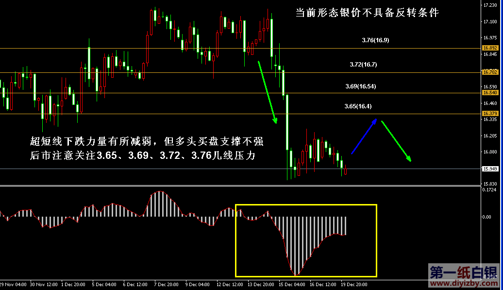 目前紙白銀價(jià)格是3.559/克。昨日紙白銀小幅下跌,由于目前銀價(jià)所處支撐較金價(jià)弱,故而其走勢亦不如黃金強(qiáng)勢。正如我們之前所說,目前銀價(jià)在該支撐位直接形成V型反轉(zhuǎn)的可能性極低,因此即使行情出現(xiàn)反彈,后市走勢或再度出現(xiàn)回踩,穩(wěn)健者可耐心等待銀價(jià)反彈遇阻后順勢做空,而激進(jìn)者在嚴(yán)格止損的前提下,可輕倉博取反彈行情,建議投資者主要關(guān)注3.51(15.8)和3.4(15.4)兩線支撐,其中3.4的支撐與目前黃金所處支撐位的買盤強(qiáng)度相似,若銀價(jià)有望回落至此,則其走勢強(qiáng)弱程度將與金價(jià)同步,否則在3.51上方其強(qiáng)度將弱于黃金反彈(中線支撐3.4>3.51)。如下圖所示為白銀4小時(shí)周期走勢圖,從短線形態(tài)來看,銀價(jià)當(dāng)前走勢并不具備反轉(zhuǎn)的條件,雖然動(dòng)能指標(biāo)出現(xiàn)收量跡象,但僅僅暗示短線下跌動(dòng)能有所減弱,根據(jù)近兩日行情反彈與回落情況來看,銀價(jià)多頭力量相對疲軟,買盤支撐不強(qiáng)勁,行情再度反彈遇阻3.65(16.4)、3.69(16.54)、3.72(16.7)、3.76(16.9)幾線后,出現(xiàn)沖高回落的可能性極大,投資者當(dāng)下應(yīng)以高拋為主,低吸為輔,在真正確立銀價(jià)守穩(wěn)3.51或3.4之前,多單需保持輕倉和嚴(yán)格止損。正如圖中綠色箭頭所示,當(dāng)前短線主趨勢仍為下跌,而近期行情因下跌力量減弱存在反彈修復(fù)的可能性,但其尚不能直接改變原有下跌趨勢,行情上方阻力重重,當(dāng)銀價(jià)再次來到壓力位后,走勢繼續(xù)延續(xù)前期回落下跌的概率較大。綜合分析,無論從形態(tài)、信號、支撐位強(qiáng)度來看,銀價(jià)在3.51附近直接V型反轉(zhuǎn)的可能性極低,投資者若要直接布局多單博取未來行情一飛沖天的難度較大。預(yù)計(jì)后市行情必然再度出現(xiàn)反復(fù),考慮到近期銀價(jià)并未真正觸及阻力便出現(xiàn)回落,可見多頭力量薄弱,后市行情若觸及上述4線強(qiáng)阻后,走勢或再度掉頭向下運(yùn)行,屆時(shí)將是考驗(yàn)銀價(jià)能否守穩(wěn)3.51或是否回踩更大支撐3.4的關(guān)鍵時(shí)刻。相對來說,目前銀價(jià)若能先出現(xiàn)一輪反彈行情,則超短線高拋?zhàn)隹盏睦麧櫤惋L(fēng)險(xiǎn)更低。(注: 由于紙白銀價(jià)格是國際銀價(jià)換算而來,而換算過程中涉及到人民幣對美元匯率的變化,即使在國際銀價(jià)不變化的情況下,如果人民幣貶值或升值,也會(huì)導(dǎo)致紙白銀價(jià)格出現(xiàn)變動(dòng)。因此,我們的分析只采用最新的國際銀價(jià)對應(yīng)的人民幣白銀價(jià)格,如與過去分析價(jià)格有出入, 投資者應(yīng)知曉其原因。)