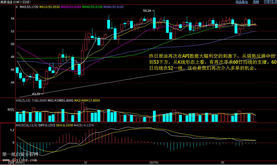 白銀價格昨日最高18.1美元,市場在面臨強壓力的同時,昨日又再創新高。我們在謹慎持有多單中跟隨市場上行。白銀目前在技術指標中長期背離,不斷的拿下一個個高點,再次演繹了技術指標的滯后性。這就是市場趨勢的力量,在如此趨勢下,投資者不可盲目做空。在面臨強壓力區域,我們可以對多單進行堅持或者可以出局,但一定不可以做空,這是必須執行的交易紀律。 目前投資者可等待回落繼續做多,但堅決不能做空,做多點位在10日均線和20日均線之間17.4~17.7,止損17.2下方,目標18.15。 再來看看原油走勢,昨日原油再次在API數據大幅利空的刺激下,從強勢反彈中回到53下方。從K線形態上看,有再次尋求60日均線支撐的跡象,60日均線在52一線,這也是我們再次介入多單的機會。