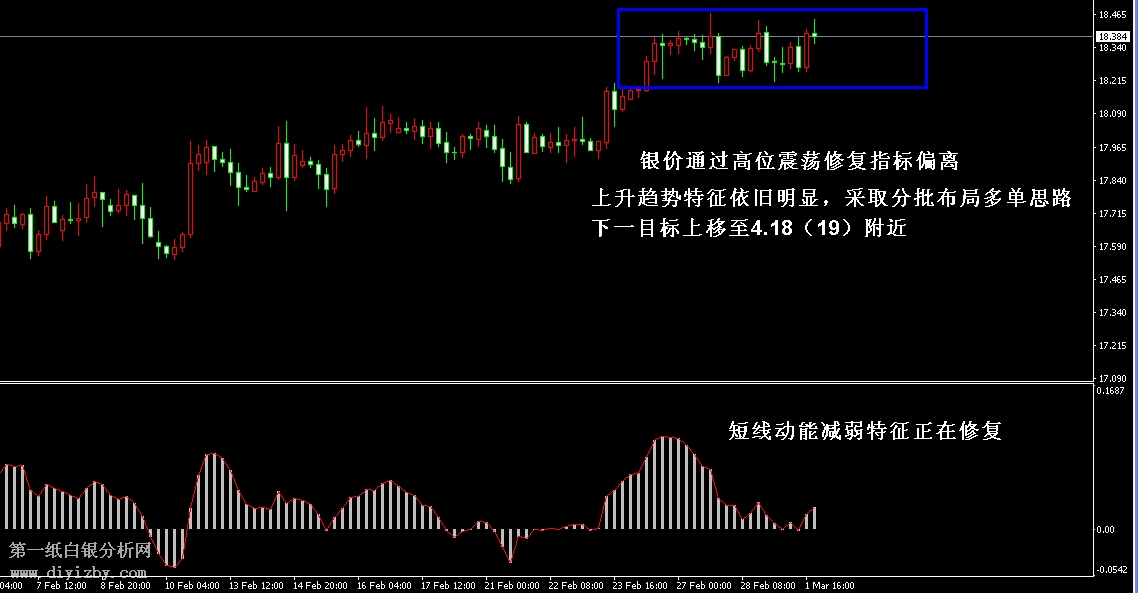 今日下方關鍵支撐位3.96~3.98(18~18.1)、3.91(17.8)、3.85(17.5)、3.8~3.81(17.25~17.3)、3.74(17);今日上方關鍵阻4.04(18.35)、4.18(19)、4.37(19.8)。 原油:原油仍處于反復震蕩之中,不過根據近期油價表現來看,最終向上突破55.2的可能性極高。目前建議投資者多看少動,區間內已無較大的高拋低吸空間,激進者可在油價回落至53下方采取分批加倉多單的思路,其中49.5~51.5為重要的支撐帶,可在該范圍著重補倉。穩健者耐心等待油價突破,一旦突破區間后,立即順勢跟進,由于此輪原油震蕩時間較長,突破后的爆發力將極大,空間亦較大。 技術僅僅是基于概率論和統計學的一種綜合分析手段,絕非預測。所以技術分析是在考慮做好止損的情況下去博取大概率事件,投資不可過于迷信技術分析。(短線操作請一定做好止損,一旦被損,代表分析師基于概率和統計的技術分析不適用于當前行情) 1、紙白銀短線看點位,中線做方向。 2、以上所有價格為工商銀行買入價,即紙白銀低價。進倉點位要再加0.04,出倉則不要。 3、第一紙白銀給出的所有建議僅供投資者參考,不作為下單絕對依據,切勿過于依賴。 4、北京時間07:00發布此文章。 5、上一交易日白銀價格分析情況:(3月1日)白銀多頭力量減弱 減倉回撤后再買入多單