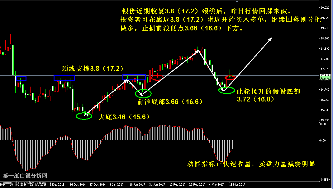 目前紙白銀價(jià)格是3.821克。昨日白銀價(jià)格小幅沖高回落,但并未改變走勢(shì)已經(jīng)轉(zhuǎn)強(qiáng)的事實(shí),近期行情已經(jīng)由下跌轉(zhuǎn)變?yōu)檎鹗幧蠞q格局,且有望圍繞低點(diǎn)3.72(16.8)為底部展開一輪拉升,投資者應(yīng)在回落中分批買入多單。如下圖所示為白銀日線走勢(shì)圖,藍(lán)色框顯示銀價(jià)頸線壓力位在3.8(17.2)附近,該點(diǎn)位曾令行情發(fā)生多次回落,當(dāng)走勢(shì)收復(fù)該點(diǎn)位后,此處轉(zhuǎn)變?yōu)閺?qiáng)支撐。圖中紅色框顯示銀價(jià)上一次和昨日回踩頸線支撐的情況,行情有望在回踩該點(diǎn)位后繼續(xù)向上拉升,投資者可靠近3.8(17.2)附近開始買入多單,繼續(xù)回落則分批做多,止損前浪低點(diǎn)3.66(16.6)下方。如圖中白色箭頭所示,銀價(jià)大趨勢(shì)維持震蕩上行格局,該上行走勢(shì)的“大底”為2017年內(nèi)低點(diǎn)3.46(15.6)附近,依靠該點(diǎn)位銀價(jià)產(chǎn)生了第一浪上漲形態(tài);3.66(16.6)為前浪底部,依靠該點(diǎn)位銀價(jià)產(chǎn)生了第二浪上漲形態(tài);3.72(16.8)為近期回調(diào)低點(diǎn),也是假設(shè)的本浪底部,行情亦有望圍繞該點(diǎn)位展開第三浪拉升形態(tài)。目前走勢(shì)正剛剛轉(zhuǎn)變形態(tài),距離假設(shè)底部3.72(17.2)距離較近,投資者應(yīng)靠近該點(diǎn)位分批加倉(cāng)多單,等待行情上漲后將獲得中線拉升所帶來(lái)的利潤(rùn)。綜合分析,2017年上半年我們定義為趨勢(shì)行情,因此整體格局將以上漲為主基調(diào),在此背景下,銀價(jià)凡是遇到回調(diào)走勢(shì),均是為新的上漲而奠定基礎(chǔ),投資者在回調(diào)中分批買入多單將在未來(lái)銀價(jià)上漲后獲得理想的利潤(rùn)。本周走勢(shì)完成了由“回調(diào)--上漲”的變化,在該變化初期,也是投資者買入成本最低的時(shí)候,后期短線目標(biāo)將逐漸看至3.92(17.7)、3.98(18),中線目標(biāo)將看至4.18(19)附近。(注: 由于紙白銀價(jià)格是國(guó)際銀價(jià)換算而來(lái),而換算過(guò)程中涉及到人民幣對(duì)美元匯率的變化,即使在國(guó)際銀價(jià)不變化的情況下,如果人民幣貶值或升值,也會(huì)導(dǎo)致紙白銀價(jià)格出現(xiàn)變動(dòng)。因此,我們的分析只采用最新的國(guó)際銀價(jià)對(duì)應(yīng)的人民幣白銀價(jià)格,如與過(guò)去分析價(jià)格有出入, 投資者應(yīng)知曉其原因。)