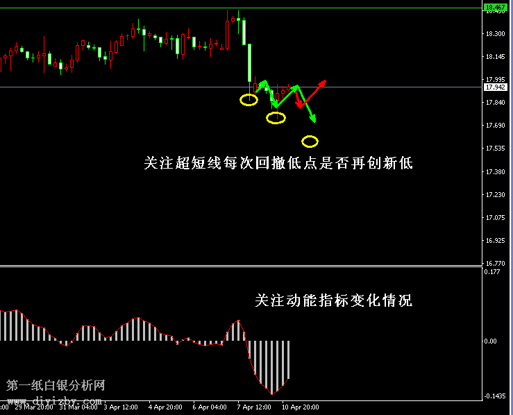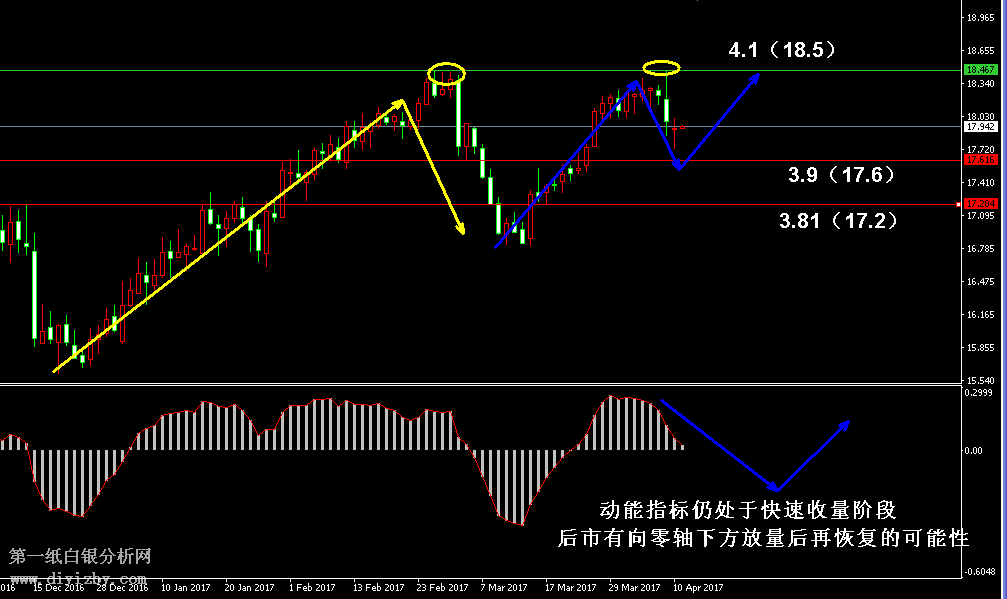 今日下方關(guān)鍵支撐位3.9(17.6)、3.85(17.4)、3.81(17.2)、3.72(16.8);今日上方關(guān)鍵阻4.01(18.1)、4.05(18.3)、4.1(18.5)、4.18(19)。 技術(shù)僅僅是基于概率論和統(tǒng)計(jì)學(xué)的一種綜合分析手段,絕非預(yù)測(cè)。所以技術(shù)分析是在考慮做好止損的情況下去博取大概率事件,投資不可過于迷信技術(shù)分析。(短線操作請(qǐng)一定做好止損,一旦被損,代表分析師基于概率和統(tǒng)計(jì)的技術(shù)分析不適用于當(dāng)前行情) 1、紙白銀短線看點(diǎn)位,中線做方向。 2、以上所有價(jià)格為工商銀行買入價(jià),即紙白銀低價(jià)。進(jìn)倉(cāng)點(diǎn)位要再加0.04,出倉(cāng)則不要。 3、第一紙白銀給出的所有建議僅供投資者參考,不作為下單絕對(duì)依據(jù),切勿過于依賴。 4、北京時(shí)間07:00發(fā)布此文章。 5、上一交易日白銀價(jià)格分析情況:(4月10日)白銀短線或維持調(diào)整 中線看漲趨勢(shì)仍不變