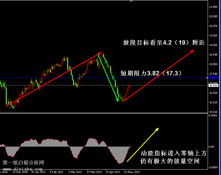 今日下方關(guān)鍵支撐位3.64(16.45)、3.6(16.25)、3.52(15.9)、3.45(15.6);今日上方關(guān)鍵阻3.76(17)、3.82(17.3)、3.9(17.65)、3.98(18)、4.07(18.4)、4.2(19)。 技術(shù)僅僅是基于概率論和統(tǒng)計(jì)學(xué)的一種綜合分析手段,絕非預(yù)測(cè)。所以技術(shù)分析是在考慮做好止損的情況下去博取大概率事件,投資不可過于迷信技術(shù)分析。(短線操作請(qǐng)一定做好止損,一旦被損,代表分析師基于概率和統(tǒng)計(jì)的技術(shù)分析不適用于當(dāng)前行情) 1、紙白銀短線看點(diǎn)位,中線做方向。 2、以上所有價(jià)格為工商銀行買入價(jià),即紙白銀低價(jià)。進(jìn)倉(cāng)點(diǎn)位要再加0.04,出倉(cāng)則不要。 3、第一紙白銀給出的所有建議僅供投資者參考,不作為下單絕對(duì)依據(jù),切勿過于依賴。 4、北京時(shí)間07:00發(fā)布此文章。 5、上一交易日白銀價(jià)格分析情況:(5月17日)白銀處于上漲初始階段 繼續(xù)拉升是主旋律