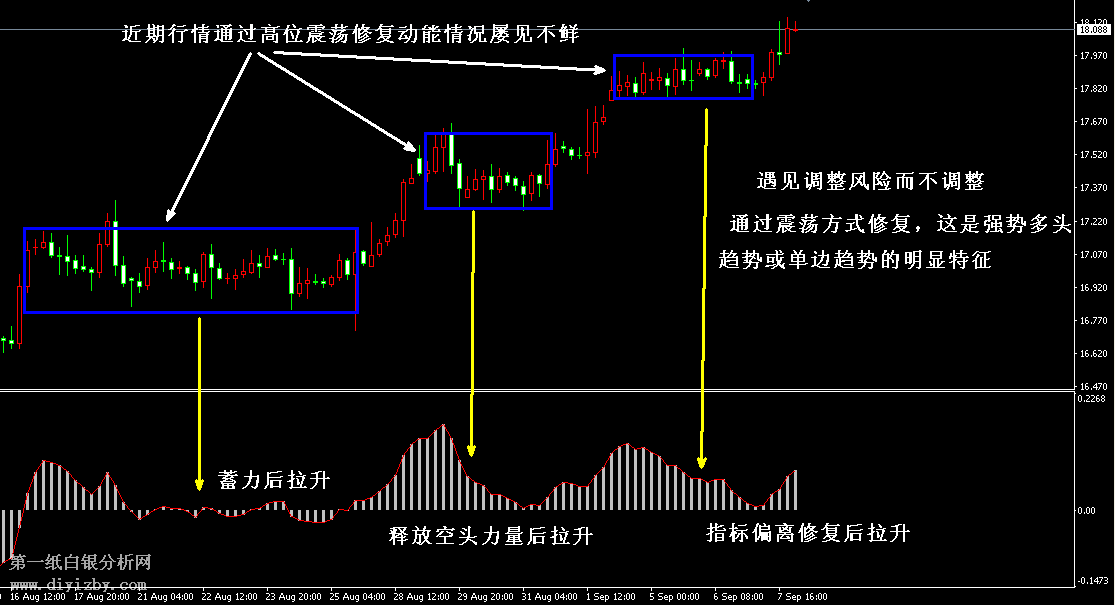 目前紙白銀價格是3.767元/克。昨日白銀價格震蕩后大幅拉升,正如我們之前所說,在當前強勢上升趨勢中,銀價即使存在調整風險,其也可能通過高位震蕩的方式修復動能,行情存在小幅調整或不調整直接延續上漲的可能性,故而始終建議投資者勿盲目做空,凡是遇見回落均采取分批做多方式布局。昨日銀價走勢正驗證了這一點,投資者若在回落中采取分批2~3分方式補倉多單,同時持有部分“底倉”,則此時銀價拉升后,便可跟隨上漲逐漸擴大利潤。如下圖所示為白銀4小時周期走勢圖,我們從短期銀價形態來看看目前走勢的變化,圖中藍色框所示為近期行情三次拉升前后的形態,藍色框所示銀價在拉升前后均處于震蕩狀態,每每白銀經歷一輪上漲后,多頭力量必然消耗過大,此時市場存在一定獲利了結盤打壓,同時下一輪短線上漲買盤力量不足。在數次行情存在調整風險的情況下,銀價并未通過大幅下跌的方式修復指標或蓄力,而是通過高位“空中加油”的方式修復,以時間換取空間來逐步釋放空頭力量和積蓄買盤動能。這種“遇見調整風險而不調整”,通過震蕩方式修復指標的情況是強勢多頭的表現,在歷史行情統計中大多數單邊趨勢往往出現如此情況,此種走勢中也需投資者務必始終持有部分“底倉”多單,防止銀價不調整而踏空,投資者可利用“底倉”多單將利潤最大化,直至趨勢反轉后再離場該部分倉位;另外,在如此強勢趨勢形態下,投資者務必堅持采取分批布局多單的策略,需放棄任何可能做空的機會,將回調行情視作為下一輪銀價上漲布局多單的機會,遇見強阻力僅僅采取減倉獲利多單,絕不可輕易做空。綜合分析:近期行情在連續多日橫盤整理后又迎來大幅拉升,即使如此,走勢并無任何見頂和反轉的風險,各個周期多頭依舊充足,預計后市行情仍將延續上漲。我們多次強調,此輪上漲屬于“三大趨勢統一”后的上漲,銀價將開啟2017年下半年的中線拉升行情,最終目標有望突破3.88(18.65)的年內高點,并依次考驗3.96(19)、4.06(19.5)兩大中線壓力。(注: 由于紙白銀價格是國際銀價換算而來,而換算過程中涉及到人民幣對美元匯率的變化,即使在國際銀價不變化的情況下,如果人民幣貶值或升值,也會導致紙白銀價格出現變動。因此,我們的分析只采用最新的國際銀價對應的人民幣白銀價格,如與過去分析價格有出入, 投資者應知曉其原因。)