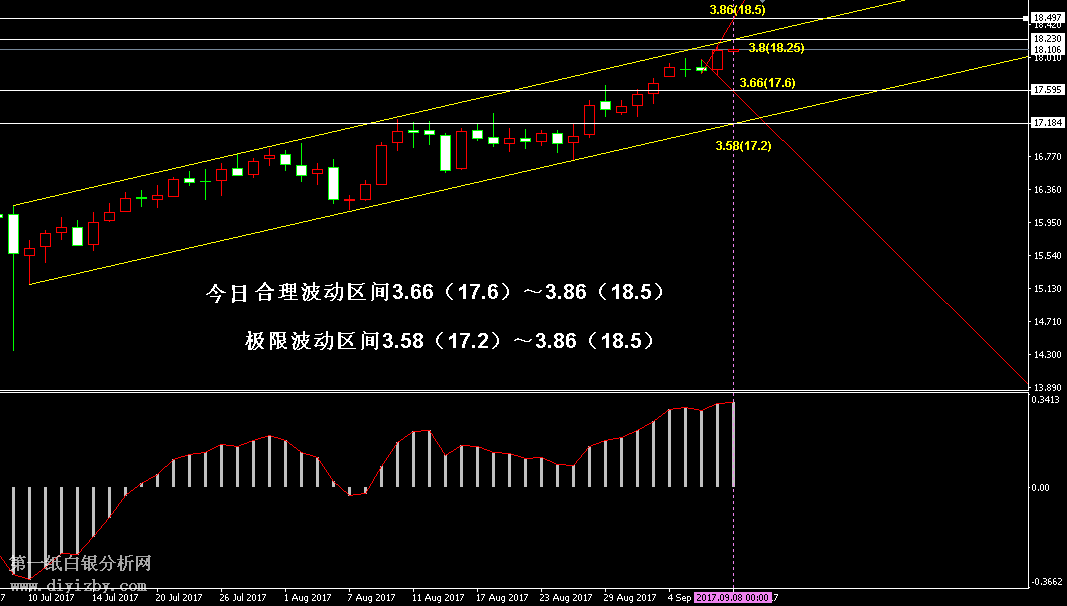 技術僅僅是基于概率論和統計學的一種綜合分析手段,絕非預測。所以技術分析是在考慮做好止損的情況下去博取大概率事件,投資不可過于迷信技術分析。(短線操作請一定做好止損,一旦被損,代表分析師基于概率和統計的技術分析不適用于當前行情) 1、紙白銀短線看點位,中線做方向。 2、以上所有價格為工商銀行買入價,即紙白銀低價。進倉點位要再加點差(各銀行點差不一),出倉則不要。 3、第一紙白銀給出的所有建議僅供投資者參考,不作為下單絕對依據,切勿過于依賴。 4、北京時間08:00發布此文章。 5、上一交易日白銀價格分析情況:(9月7日)白銀短線存調整風險 趨勢看多回調中買入