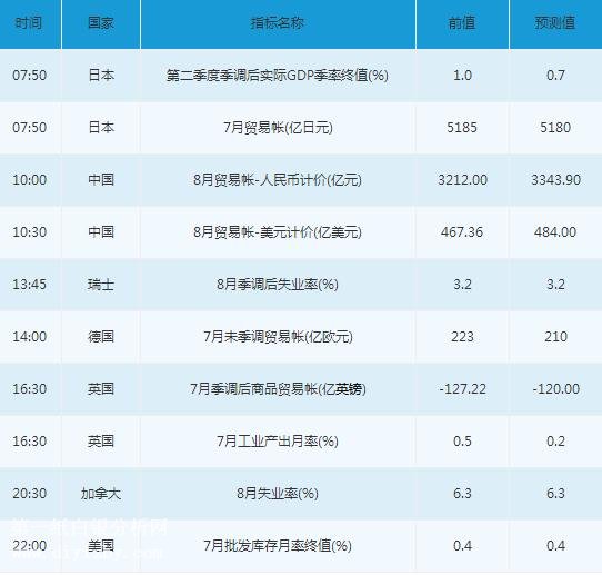 周五(9月8日)亞洲時段,投資者首先需關注07:50公布的日本第二季度季調后實際GDP季率終值以及日本7月貿(mào)易帳。此后,投資者需關注10:00公布的以人民幣計價的中國8月貿(mào)易帳以及10:30公布的帳以美元計價的中國8月貿(mào)易帳。