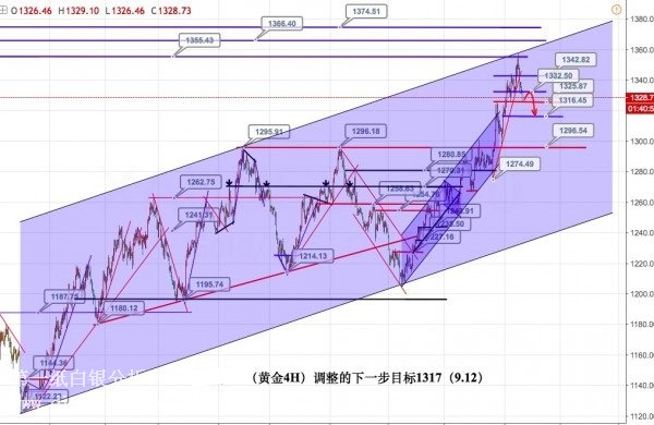 1:黃金觸及1122-1305-1295的上升通道1357后承壓回落!