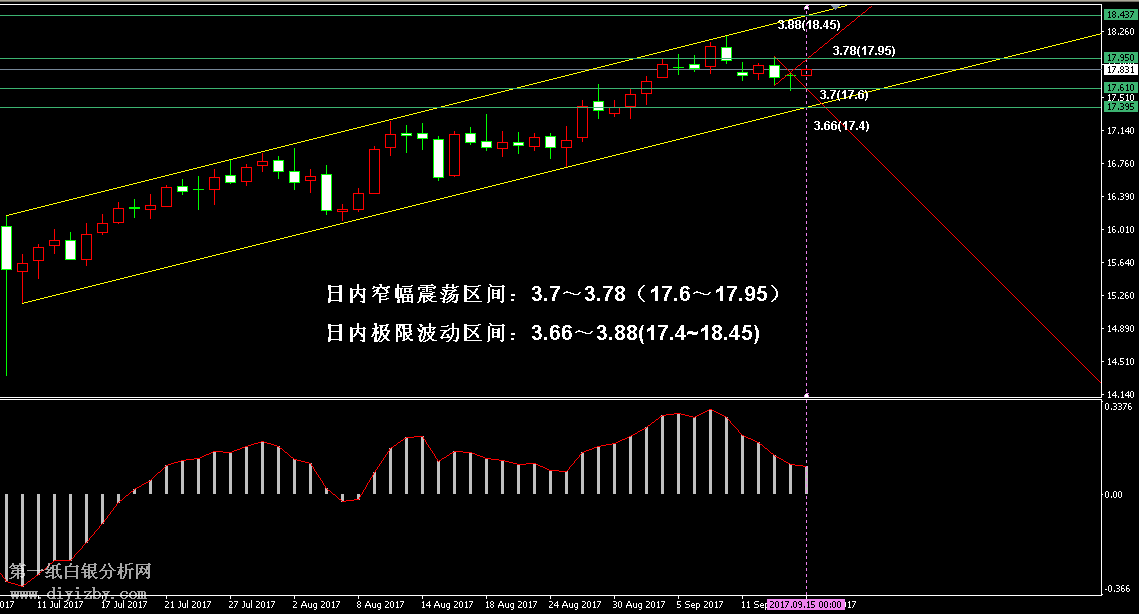 技術僅僅是基于概率論和統計學的一種綜合分析手段,絕非預測。所以技術分析是在考慮做好止損的情況下去博取大概率事件,投資不可過于迷信技術分析。(短線操作請一定做好止損,一旦被損,代表分析師基于概率和統計的技術分析不適用于當前行情) 1、紙白銀短線看點位,中線做方向。 2、以上所有價格為工商銀行買入價,即紙白銀低價。進倉點位要再加點差(各銀行點差不一),出倉則不要。 3、第一紙白銀給出的所有建議僅供投資者參考,不作為下單絕對依據,切勿過于依賴。 4、北京時間08:00發布此文章。 5、上一交易日白銀價格分析情況:(9月14日)白銀進入密集支撐區域 調整繼續空間有限