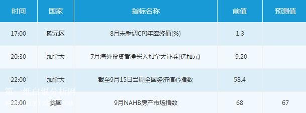美國時段,投資者需關注20:30公布的加拿大7月海外投資者凈買入加拿大證券。此后,投資者可關注22:00公布的美國9月NAHB房產市場指數以及加拿大截至9月15日當周全國經濟信心指數。
