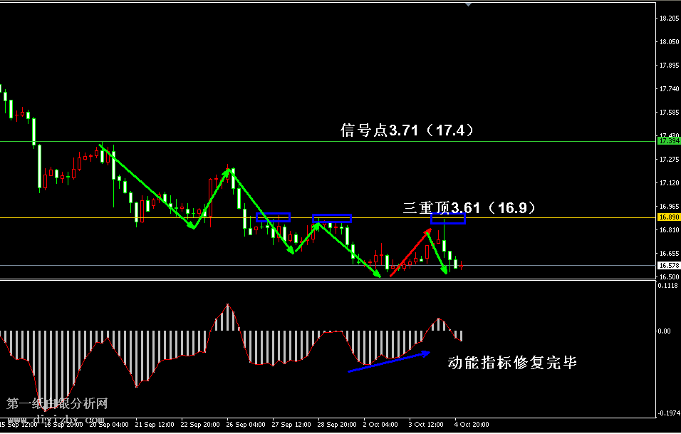 目前紙白銀價(jià)格是3.541元/克。昨日白銀價(jià)格再次沖高回落,正如我們所說,目前銀價(jià)主趨勢(shì)處于下跌格局,行情短線指標(biāo)修復(fù)雖有意反彈,但走勢(shì)一旦完成修復(fù)后,行情將再次下行。果不其然,昨日銀價(jià)在沖擊雙頂3.61(16.9)后大幅回落,形態(tài)上仍然符合大趨勢(shì)下行的格局,在最終企穩(wěn)信號(hào)未出現(xiàn)之前,我們認(rèn)為行情維持震蕩式下跌格局的可能性較大,短線操作可以高拋低吸應(yīng)對(duì),其中主要以反彈阻力位分批高拋為主。如下圖所示為白銀4小時(shí)周期走勢(shì)圖,圖中黃線所示處為昨日銀價(jià)反彈高點(diǎn),由于此處已經(jīng)第三次未能突破,在形態(tài)上該點(diǎn)位3.61(16.9)形成了三重頂形態(tài),這僅僅是銀價(jià)距離企穩(wěn)信號(hào)點(diǎn)3.71(17.4)的最近的壓力位,由此可見行情多頭力量著實(shí)不足,而空頭仍然處于主導(dǎo)。圖中藍(lán)色箭頭顯示過去48小時(shí),銀價(jià)因短線下跌力量不足而出現(xiàn)底背離形態(tài),由此引發(fā)了一輪連續(xù)性反彈,隨著昨日銀價(jià)反彈至3.61(16.9)附近,此輪空頭力量不足的情形已經(jīng)修復(fù),銀價(jià)顯然在3.61(16.9)的強(qiáng)阻力獲得了更多的賣盤力量,才導(dǎo)致昨日行情沖高后大幅回落。圖中綠色箭頭便為當(dāng)前銀價(jià)的主趨勢(shì)下跌,從本周的一漲一跌可以看出,當(dāng)前走勢(shì)正維持良好的震蕩式下跌格局,銀價(jià)通過反彈的方式修復(fù)賣盤力量不足,當(dāng)重新獲得新的拋壓后,走勢(shì)將繼續(xù)回落創(chuàng)出新低。就目前格局而言,經(jīng)歷了昨日大跌后,空頭力量明顯增強(qiáng),銀價(jià)繼續(xù)回落的風(fēng)險(xiǎn)增大,建議投資者今日可繼續(xù)持有昨日空單,激進(jìn)者采取反彈分批加倉空單方式布局,目標(biāo)看至新低3.48~3.5(16.3~16.4)附近離場(chǎng)。綜合分析:近期行情的反彈不僅僅完成了空頭力量的修復(fù),更在反彈遇阻后釋放了部分多頭力量,在重新獲得拋壓增強(qiáng)后,有利于銀價(jià)繼續(xù)下行。目前形態(tài)上還未出現(xiàn)任何企穩(wěn)止跌的跡象,建議投資者繼續(xù)以高拋低吸策略應(yīng)對(duì),未來走勢(shì)若重新陷入震蕩后,我們才考慮行情可能向上突破信號(hào)點(diǎn)3.71(17.4)的可能性。(注: 由于紙白銀價(jià)格是國際銀價(jià)換算而來,而換算過程中涉及到人民幣對(duì)美元匯率的變化,即使在國際銀價(jià)不變化的情況下,如果人民幣貶值或升值,也會(huì)導(dǎo)致紙白銀價(jià)格出現(xiàn)變動(dòng)。因此,我們的分析只采用最新的國際銀價(jià)對(duì)應(yīng)的人民幣白銀價(jià)格,如與過去分析價(jià)格有出入, 投資者應(yīng)知曉其原因。)