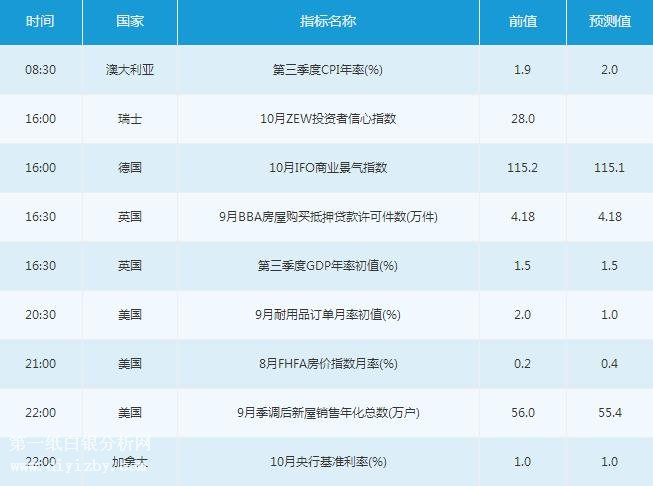 歐洲時段,投資者需關注16:00公布的德國10月IFO商業(yè)景氣指數(shù)、瑞士10月ZEW投資者信心指數(shù)。此后,投資者需關注16:30公布的英國第三季度GDP年率初值、英國9月BBA房屋購買抵押貸款許可件數(shù)。