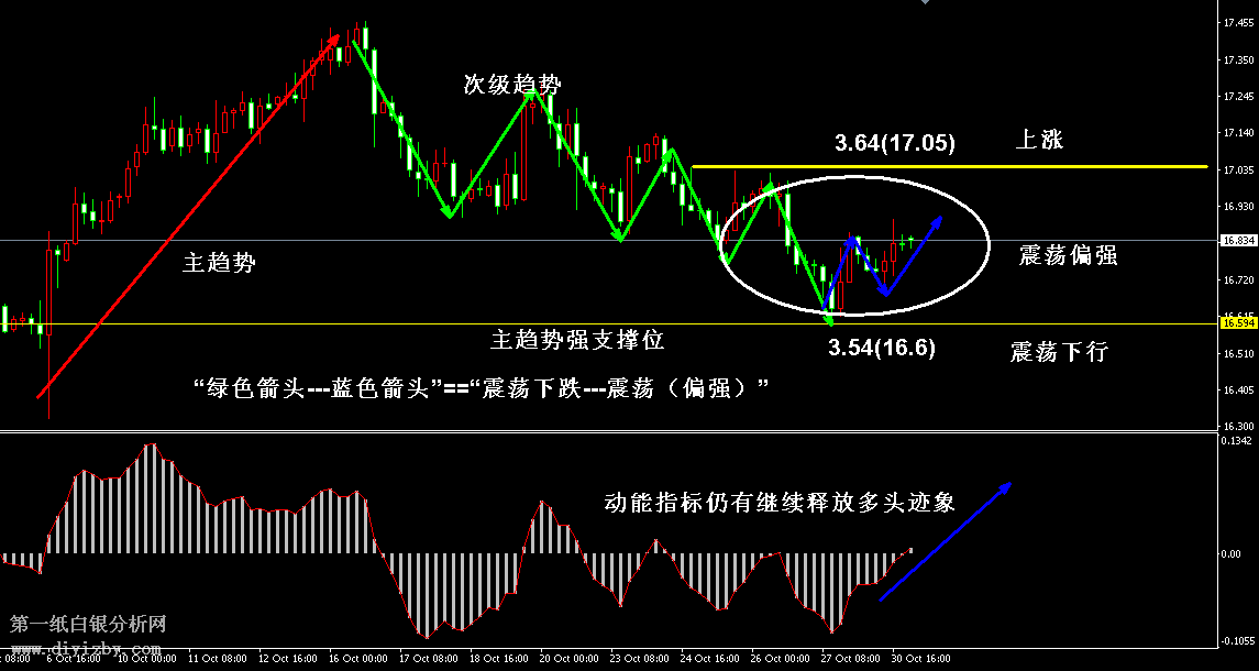 技術(shù)僅僅是基于概率論和統(tǒng)計(jì)學(xué)的一種綜合分析手段,絕非預(yù)測。所以技術(shù)分析是在考慮做好止損的情況下去博取大概率事件,投資不可過于迷信技術(shù)分析。(短線操作請(qǐng)一定做好止損,一旦被損,代表分析師基于概率和統(tǒng)計(jì)的技術(shù)分析不適用于當(dāng)前行情) 1、紙白銀短線看點(diǎn)位,中線做方向。 2、以上所有價(jià)格為工商銀行買入價(jià),即紙白銀低價(jià)。進(jìn)倉點(diǎn)位要再加點(diǎn)差(各銀行點(diǎn)差不一),出倉則不要。 3、第一紙白銀給出的所有建議僅供投資者參考,不作為下單絕對(duì)依據(jù),切勿過于依賴。 4、北京時(shí)間08:40發(fā)布此文章。 5、上一交易日白銀價(jià)格分析情況:(10月30日)白銀回踩強(qiáng)支撐 能否反轉(zhuǎn)需驗(yàn)證反彈力度