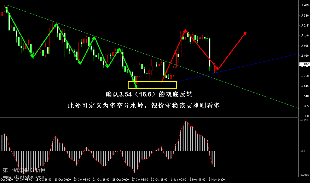 技術僅僅是基于概率論和統計學的一種綜合分析手段,絕非預測。所以技術分析是在考慮做好止損的情況下去博取大概率事件,投資不可過于迷信技術分析。(短線操作請一定做好止損,一旦被損,代表分析師基于概率和統計的技術分析不適用于當前行情) 1、紙白銀短線看點位,中線做方向。 2、以上所有價格為工商銀行買入價,即紙白銀低價。進倉點位要再加點差(各銀行點差不一),出倉則不要。 3、第一紙白銀給出的所有建議僅供投資者參考,不作為下單絕對依據,切勿過于依賴。 4、北京時間08:40發布此文章。 5、上一交易日白銀價格分析情況:(11月3日)白銀反轉已確立 非農左右短線卻難改趨勢