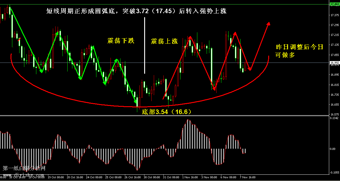 技術僅僅是基于概率論和統計學的一種綜合分析手段,絕非預測。所以技術分析是在考慮做好止損的情況下去博取大概率事件,投資不可過于迷信技術分析。(短線操作請一定做好止損,一旦被損,代表分析師基于概率和統計的技術分析不適用于當前行情) 1、紙白銀短線看點位,中線做方向。 2、以上所有價格為工商銀行買入價,即紙白銀低價。進倉點位要再加點差(各銀行點差不一),出倉則不要。 3、第一紙白銀給出的所有建議僅供投資者參考,不作為下單絕對依據,切勿過于依賴。 4、北京時間08:40發布此文章。 5、上一交易日白銀價格分析情況:(11月7日)白銀維持進三退二上漲 堅定回落布局多單