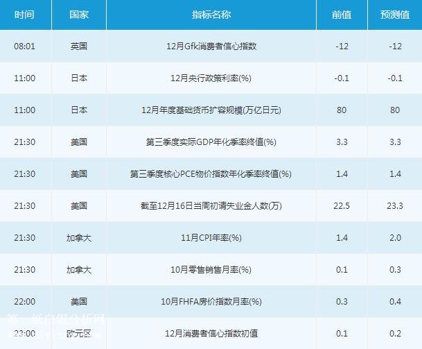 美國時段,投資者需密切關注21:30公布的美國第三季度實際GDP年化季率終值、美國第三季度核心PCE物價指數年化季率終值、美國截至12月16日當周初請失業金人數。此外,同時間公布的加拿大11月CPI年率、加拿大10月零售銷售月率也值得關注。