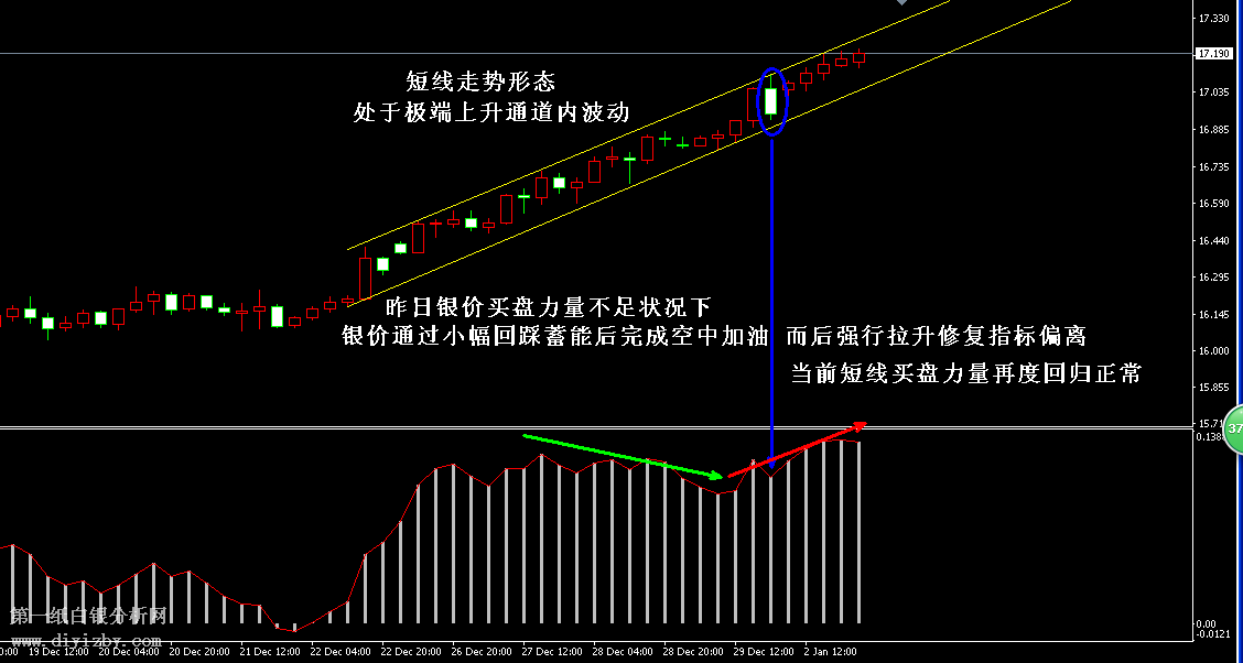 今日下方關(guān)鍵支撐位3.54(17)、3.52(16.9)、3.46(16.6)、3.42(16.4)、3.33(16)、3.28(15.6);今日上方關(guān)鍵阻力3.59~3.6(17.2~17.25)、3.67(17.6)。 技術(shù)僅僅是基于概率論和統(tǒng)計(jì)學(xué)的一種綜合分析手段,絕非預(yù)測。所以技術(shù)分析是在考慮做好止損的情況下去博取大概率事件,投資不可過于迷信技術(shù)分析。(短線操作請一定做好止損,一旦被損,代表分析師基于概率和統(tǒng)計(jì)的技術(shù)分析不適用于當(dāng)前行情) 1、文中價(jià)格為紙白銀價(jià)格,括號(hào)內(nèi)為國際銀價(jià),投資者可雙向參考。 2、以上所有價(jià)格為工商銀行買入價(jià),即紙白銀低價(jià)。進(jìn)倉點(diǎn)位要再加點(diǎn)差(各銀行點(diǎn)差不一),出倉則不要。 3、第一紙白銀給出的所有建議僅供投資者參考,不作為下單絕對(duì)依據(jù),切勿過于依賴。 4、北京時(shí)間09:11發(fā)布此文章。 5、上一交易日白銀價(jià)格分析情況:(1月2日)白銀處于極端上漲 買盤不足或空中加油