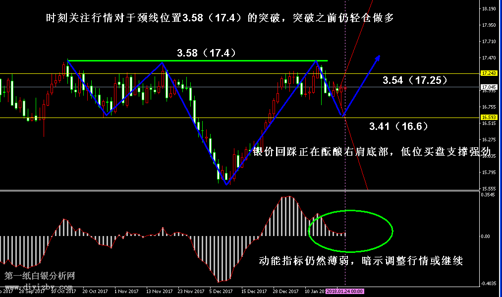 今日下方關鍵支撐位3.45(16.8)、3.41(16.6)、3.35(16.3)、3.29(16)、3.21(15.6);今日上方關鍵阻力3.55(17.25)、3.58(17.4)、3.63(17.6)、3.71(18)。 提示:技術僅僅是基于概率論和統計學的一種綜合分析手段,絕非預測。所以技術分析是在考慮做好止損的情況下去博取大概率事件,投資不可過于迷信技術分析。(短線操作請一定做好止損,一旦被損,代表分析師基于概率和統計的技術分析不適用于當前行情) 另外,由于紙白銀價格是國際銀價換算而來,而換算過程中涉及到人民幣對美元匯率的變化,即使在國際銀價不變化的情況下,如果人民幣貶值或升值,也會導致紙白銀價格出現變動。因此,我們的分析只采用最新的國際銀價對應的人民幣白銀價格,如與過去分析價格有出入, 投資者應知曉其原因。 1、文中價格為紙白銀價格,括號內為國際銀價,投資者可雙向參考。 2、以上所有價格為工商銀行買入價,即紙白銀低價。進倉點位要再加點差(各銀行點差不一),出倉則不要。 3、第一紙白銀給出的所有建議僅供投資者參考,不作為下單絕對依據,切勿過于依賴。 4、北京時間08:45發布此文章。 5、上一交易日白銀價格分析情況:(1月23日)白銀持續震蕩中 蓄勢待發醞釀新一輪上漲