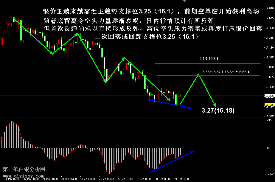 今日下方關(guān)鍵支撐位3.25(16.1)、3.19(15.8)、3.16(15.6);今日上方關(guān)鍵阻力3.36~3.37(16.6~16.65)、3.4(16.8)、3.44(17)。 提示:技術(shù)僅僅是基于概率論和統(tǒng)計學(xué)的一種綜合分析手段,絕非預(yù)測。所以技術(shù)分析是在考慮做好止損的情況下去博取大概率事件,投資不可過于迷信技術(shù)分析。(短線操作請一定做好止損,一旦被損,代表分析師基于概率和統(tǒng)計的技術(shù)分析不適用于當(dāng)前行情) 另外,由于紙白銀價格是國際銀價換算而來,而換算過程中涉及到人民幣對美元匯率的變化,即使在國際銀價不變化的情況下,如果人民幣貶值或升值,也會導(dǎo)致紙白銀價格出現(xiàn)變動。因此,我們的分析只采用最新的國際銀價對應(yīng)的人民幣白銀價格,如與過去分析價格有出入, 投資者應(yīng)知曉其原因。 1、文中價格為紙白銀價格,括號內(nèi)為國際銀價,投資者可雙向參考。 2、以上所有價格為工商銀行買入價,即紙白銀低價。進(jìn)倉點(diǎn)位要再加點(diǎn)差(各銀行點(diǎn)差不一),出倉則不要。 3、第一紙白銀給出的所有建議僅供投資者參考,不作為下單絕對依據(jù),切勿過于依賴。 4、北京時間08:45發(fā)布此文章。 5、上一交易日白銀價格分析情況:(2月9日)白銀反彈后或再次回落 將考驗(yàn)主趨勢支撐