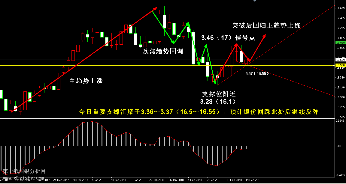 今日下方關(guān)鍵支撐位3.36~3.37(16.5~16.55)、3.33(16.35)、3.28~3.29(16.1~16.15)、3.22(15.8)、3.16(15.6);今日上方關(guān)鍵阻力3.46(17)、3.52~3.53(17.3~17.35)。 提示:技術(shù)僅僅是基于概率論和統(tǒng)計(jì)學(xué)的一種綜合分析手段,絕非預(yù)測。所以技術(shù)分析是在考慮做好止損的情況下去博取大概率事件,投資不可過于迷信技術(shù)分析。(短線操作請(qǐng)一定做好止損,一旦被損,代表分析師基于概率和統(tǒng)計(jì)的技術(shù)分析不適用于當(dāng)前行情) 另外,由于紙白銀價(jià)格是國際銀價(jià)換算而來,而換算過程中涉及到人民幣對(duì)美元匯率的變化,即使在國際銀價(jià)不變化的情況下,如果人民幣貶值或升值,也會(huì)導(dǎo)致紙白銀價(jià)格出現(xiàn)變動(dòng)。因此,我們的分析只采用最新的國際銀價(jià)對(duì)應(yīng)的人民幣白銀價(jià)格,如與過去分析價(jià)格有出入, 投資者應(yīng)知曉其原因。 1、文中價(jià)格為紙白銀價(jià)格,括號(hào)內(nèi)為國際銀價(jià),投資者可雙向參考。 2、以上所有價(jià)格為工商銀行買入價(jià),即紙白銀低價(jià)。進(jìn)倉點(diǎn)位要再加點(diǎn)差(各銀行點(diǎn)差不一),出倉則不要。 3、第一紙白銀給出的所有建議僅供投資者參考,不作為下單絕對(duì)依據(jù),切勿過于依賴。 4、北京時(shí)間08:45發(fā)布此文章。 5、上一交易日白銀價(jià)格分析情況:(2月16日)白銀突破信號(hào)點(diǎn)未果,回踩支撐后繼續(xù)沖擊