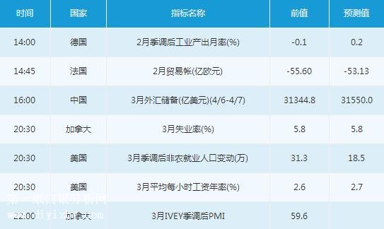 周五(4月6日)歐洲時段,投資者需關注14:00公布的德國2月季調后工業產出月率。美國時段,投資者需關注20:30公布的美國3月季調后非農就業人口變動、美國3月平均每小時工資年率。此后,投資者還需關注23:15英國央行行長卡尼將在一場國際氣候風險及監管會議中發表演說,以及次日01:30美聯儲主席鮑威爾將就經濟展望發表演講。