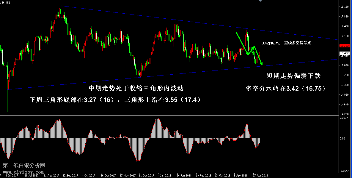 目前白銀價格是 3.37克(16.492美元/盎司)。本周銀價先跌后漲,周初走勢向下破位了前期底部支撐3.29(16.1),最低回踩至3.27(16)后停止下跌,由此打破了原有的上漲形態,短線走勢轉入相對弱勢格局之中;然而大周期行情卻仍然偏向于震蕩,盡管破位了前期低點,但日線和周線周期形成了收縮三角形形態,其中高點正不斷下移,而低點卻不斷上移,這說明目前行情正處于長期趨勢看漲、中期走勢震蕩、短期趨勢偏下跌的格局之中,由此可看出三大趨勢方向并不統一,此時投資亦不可過分看多或過分看空,應先順應短線趨勢嘗試高拋做空,而后回落考驗中期走勢的支撐關注能否守穩,整體策略保持高拋為主,低吸為輔,直至短期趨勢突破多空信號點3.42(16.75)后,屆時短期走勢與中期走勢都偏向于震蕩整理,投資者可轉而以高拋低吸策略為主;同理,當短期走勢向上突破收縮三角形上沿后,短線與中期趨勢將轉入上漲格局,進而三大趨勢完成方向統一,屆時投資者方可再次嘗試單邊做多思路。如下圖所示為白銀日線走勢圖,下圖藍線所示便為當前銀價中期走勢所處的收縮三角形形態,本周走勢正是依靠三角形下沿支撐3.27(16)而出現觸底反彈;圖中綠色箭頭所示為短期趨勢的下跌形態,目前銀價雖然依靠中期支撐而出現反彈,但并未向上突破圖中紅線所示的多空信號點3.42(16.75),短線趨勢浪型依舊處于下跌格局之中。若此下跌形態不能被打破,一旦走勢延續震蕩下跌方式運行,則投資者需謹防后市銀價向下跌破3.27(16)三角形下沿的風險,屆時短線與中期走勢都將進入下跌,更進一步增強空頭力量。基于上述原因,投資者目前可先以短線趨勢為主要參考形態,下周行情反彈至3.38~3.39(16.55~16.6)的阻力位附近仍可輕倉高拋做空,止損3.42(16.75)上方,目標看至3.29~3.3(16.15~16.2)離場,同時注三角形下沿支撐3.27(16)能否守穩;若守穩3.27(16),則可在支撐位3.29~3.3(16.15~16.2)附近輕倉低吸做多,嚴格止損3.27(16)下方。直至最終銀價向上突破3.42(16.75)的短線多空信號點后,投資者可完全在三角形大區間3.27~3.55(16~17.4)進行高拋低吸,接著突破該大區間后,投資者可順勢操作.。綜合分析,由不同趨勢組成了當下走勢,我們建議投資者先順應短線下跌趨勢進行阻力位高拋做空,而后若守穩三角形下沿后可小幅低吸做多。當行情突破短線多空信號點3.42(16.75)后,可開始順應中期走勢在收縮三角形內進行高拋低吸(震蕩操作);接著行情若突破收縮三角形后,可開始順勢跟進并單邊操作(趨勢行情策略)。(注: 由于紙白銀價格是國 際銀價換算而來,而換算過程中涉及到人民幣對美元匯率的變化,即使在國際銀價不變化的情 況下,如果人民幣貶值或升值,也會導致紙白銀價格出現變動。因此,我們的分析只采用最新 的國際銀價對應的人民幣白銀價格,如與過去分析價格有出入, 投資者應知曉其原因。)