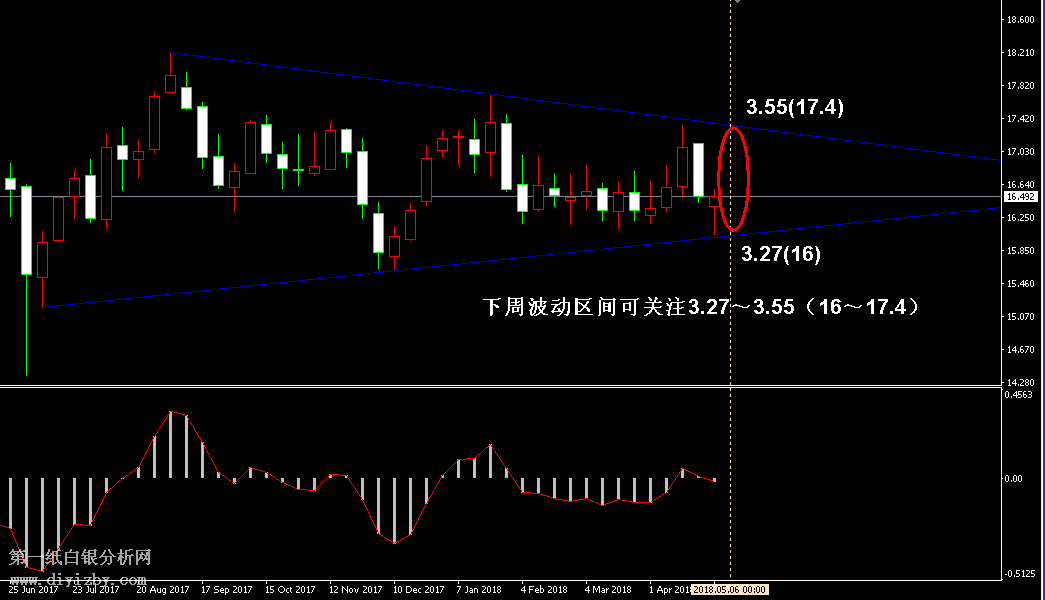 下周投資者可首先關注周線收縮三角形區間3.27~3.55(16~17.4),但此區間并非白銀下周的絕對波動空間,由于短線走勢尚未改變下跌形態,因此在其未止跌之前,此區間仍存在下破風險。當走勢突破3.42(16.75)的短線多空分水嶺后,該區間3.27~3.55(16~17.4)將較為安全,屆時投資者應主要在該區間內進行高拋低吸的策略,走勢也真正轉入大區間震蕩行情之中。