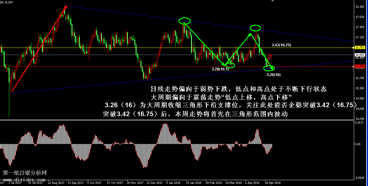 今日下方關(guān)鍵支撐3.29~3.3(16.15~16.2)、3.26(16)、3.22(15.8)、3.18(15.6);今日上方關(guān)鍵阻3.38~3.39(16.55~16.6)、3.42(16.75)、3.47~3.48(17~17.05)、3.55(17.4)。 提示:技術(shù)僅僅是基于概率論和統(tǒng)計學的一種綜合分析手段,絕非預(yù)測。所以技術(shù)分析是在考慮做好止損的情況下去博取大概率事件,投資不可過于迷信技術(shù)分析。(短線操作請一定做好止損,一旦被損,代表分析師基于概率和統(tǒng)計的技術(shù)分析不適用于當前行情) 另外,由于紙白銀價格是國際銀價換算而來,而換算過程中涉及到人民幣對美元匯率的變化,即使在國際銀價不變化的情況下,如果人民幣貶值或升值,也會導致紙白銀價格出現(xiàn)變動。因此,我們的分析只采用最新的國際銀價對應(yīng)的人民幣白銀價格,如與過去分析價格有出入, 投資者應(yīng)知曉其原因。 1、文中價格為紙白銀價格,括號內(nèi)為國際銀價,投資者可雙向參考。 2、以上所有價格為工商銀行買入價,即紙白銀低價。進倉點位要再加點差(各銀行點差不一),出倉則不要。 3、第一紙白銀給出的所有建議僅供投資者參考,不作為下單絕對依據(jù),切勿過于依賴。 4、北京時間09:00發(fā)布此文章。 5、上一交易日白銀價格分析情況:(5月4日)白銀阻力位沖高回落 等待非農(nóng)指引方向