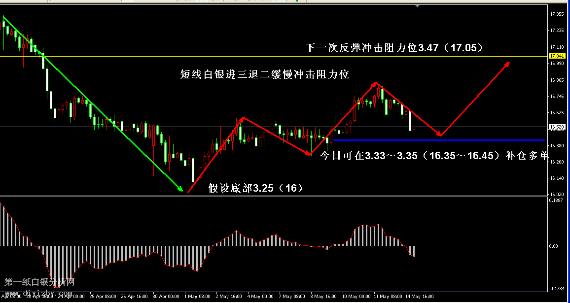 今日下方關(guān)鍵支撐3.33~3.35(16.35~16.45)、3.29~3.3(16.2~16.25)、3.25~3.26(16~16.05);今日上方關(guān)鍵阻3.47~3.5(17.05~17.2)、3.52(17.3)。 提示:技術(shù)僅僅是基于概率論和統(tǒng)計(jì)學(xué)的一種綜合分析手段,絕非預(yù)測(cè)。所以技術(shù)分析是在考慮做好止損的情況下去博取大概率事件,投資不可過(guò)于迷信技術(shù)分析。(短線操作請(qǐng)一定做好止損,一旦被損,代表分析師基于概率和統(tǒng)計(jì)的技術(shù)分析不適用于當(dāng)前行情) 另外,由于紙白銀價(jià)格是國(guó)際銀價(jià)換算而來(lái),而換算過(guò)程中涉及到人民幣對(duì)美元匯率的變化,即使在國(guó)際銀價(jià)不變化的情況下,如果人民幣貶值或升值,也會(huì)導(dǎo)致紙白銀價(jià)格出現(xiàn)變動(dòng)。因此,我們的分析只采用最新的國(guó)際銀價(jià)對(duì)應(yīng)的人民幣白銀價(jià)格,如與過(guò)去分析價(jià)格有出入, 投資者應(yīng)知曉其原因。 1、文中價(jià)格為紙白銀價(jià)格,括號(hào)內(nèi)為國(guó)際銀價(jià),投資者可雙向參考。 2、以上所有價(jià)格為工商銀行買(mǎi)入價(jià),即紙白銀低價(jià)。進(jìn)倉(cāng)點(diǎn)位要再加點(diǎn)差(各銀行點(diǎn)差不一),出倉(cāng)則不要。 3、第一紙白銀給出的所有建議僅供投資者參考,不作為下單絕對(duì)依據(jù),切勿過(guò)于依賴(lài)。 4、北京時(shí)間09:00發(fā)布此文章。 5、上一交易日白銀價(jià)格分析情況:(5月14日)白銀進(jìn)入震蕩形態(tài) 延續(xù)反彈考驗(yàn)區(qū)間阻力