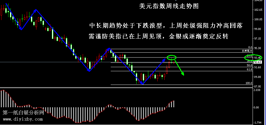 白銀短線分析:(波段:持倉(cāng)觀望;短線:先低吸,后高拋)。 對(duì)于白銀的后市的走勢(shì)我們?nèi)匀怀謽?lè)觀態(tài)度,特別近期美元指數(shù)可能出現(xiàn)見(jiàn)頂風(fēng)險(xiǎn),這令金銀繼續(xù)看漲的可能性大幅增高。如下圖所示為美元指數(shù)周線走勢(shì)圖,從長(zhǎng)期形態(tài)來(lái)看,美元指數(shù)在近兩年一直處于震蕩下跌格局之中,圖中藍(lán)色箭頭顯示自2016年12月起,美指便開(kāi)啟了下跌之路,始終保持了“高點(diǎn)低點(diǎn)不斷下降”的浪型特征。雖然2018年初至今美指處于上漲形態(tài),但從圖中浪型來(lái)看,這只不過(guò)是下跌趨勢(shì)中的一次簡(jiǎn)單的反彈修復(fù)。直至上周,美元指數(shù)觸及了93.5的關(guān)鍵阻力位,此處是周線黃金分割線23.6%的強(qiáng)壓位置,而后其最終發(fā)生沖高回落。圖中綠色圈顯示上周美指在強(qiáng)阻力沖高回落,最終形成了上影線的十字星陰線。阻力位附近的強(qiáng)勢(shì)回落+趨勢(shì)本身處于下跌,投資者需謹(jǐn)防美元指數(shù)已經(jīng)見(jiàn)頂?shù)娘L(fēng)險(xiǎn),若后市美指重啟跌勢(shì),則依據(jù)浪型推測(cè),其價(jià)格再次向下創(chuàng)出新低的可能性較高,美元恢復(fù)跌勢(shì)后,將有助于金銀企穩(wěn)反轉(zhuǎn)并開(kāi)啟真正的上漲行情。(近期投資者可關(guān)注美元指數(shù)的走勢(shì)狀況)
