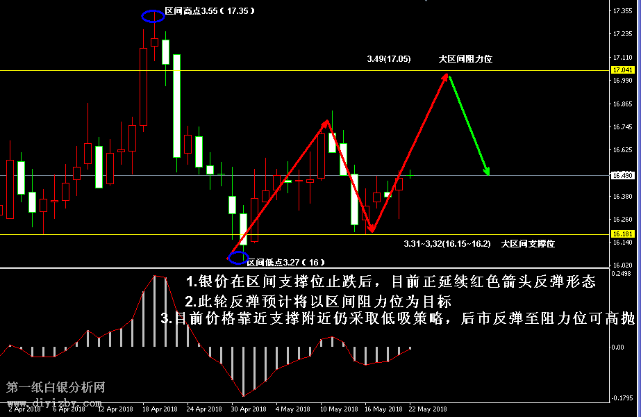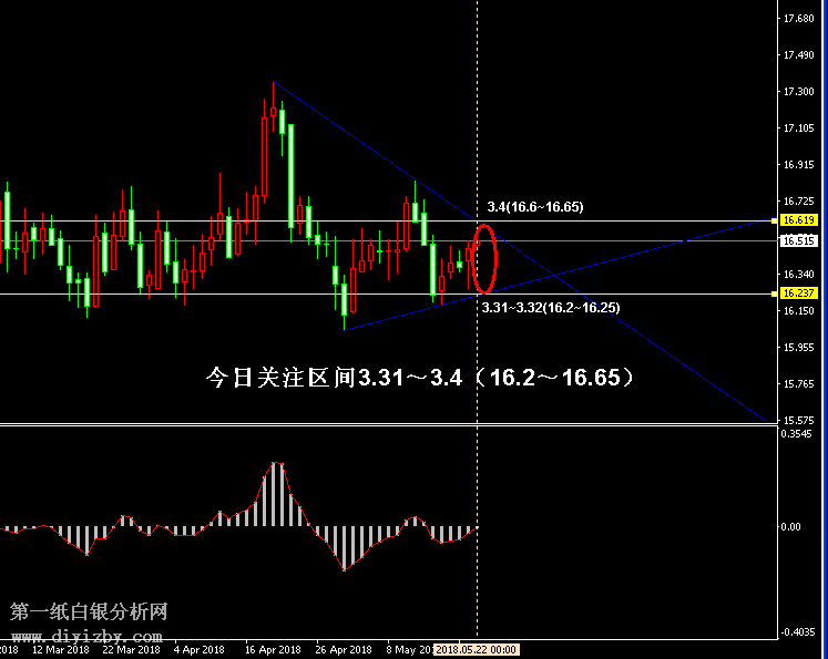 今日下方關(guān)鍵支撐3.33~3.34(16.3~16.35)、3.31(16.2)、3.27~3.29(16~16.1);今日上方關(guān)鍵阻3.4~3.41(16.65~16.7)、3.49(17.05)、3.53(17.25)、3.55(17.35)。 提示:技術(shù)僅僅是基于概率論和統(tǒng)計(jì)學(xué)的一種綜合分析手段,絕非預(yù)測(cè)。所以技術(shù)分析是在考慮做好止損的情況下去博取大概率事件,投資不可過于迷信技術(shù)分析。(短線操作請(qǐng)一定做好止損,一旦被損,代表分析師基于概率和統(tǒng)計(jì)的技術(shù)分析不適用于當(dāng)前行情) 另外,由于紙白銀價(jià)格是國際銀價(jià)換算而來,而換算過程中涉及到人民幣對(duì)美元匯率的變化,即使在國際銀價(jià)不變化的情況下,如果人民幣貶值或升值,也會(huì)導(dǎo)致紙白銀價(jià)格出現(xiàn)變動(dòng)。因此,我們的分析只采用最新的國際銀價(jià)對(duì)應(yīng)的人民幣白銀價(jià)格,如與過去分析價(jià)格有出入, 投資者應(yīng)知曉其原因。 1、文中價(jià)格為紙白銀價(jià)格,括號(hào)內(nèi)為國際銀價(jià),投資者可雙向參考。 2、以上所有價(jià)格為工商銀行買入價(jià),即紙白銀低價(jià)。進(jìn)倉點(diǎn)位要再加點(diǎn)差(各銀行點(diǎn)差不一),出倉則不要。 3、第一紙白銀給出的所有建議僅供投資者參考,不作為下單絕對(duì)依據(jù),切勿過于依賴。 4、北京時(shí)間09:00發(fā)布此文章。 5、上一交易日白銀價(jià)格分析情況:(5月21日)白銀未脫離區(qū)間震蕩 走勢(shì)先反彈沖擊阻力