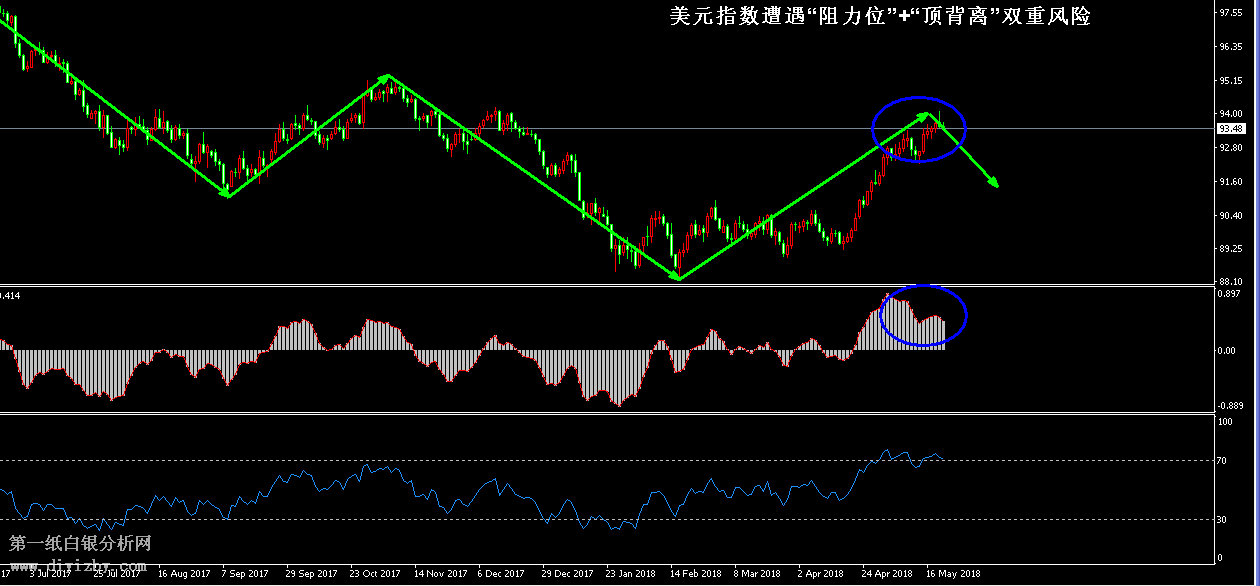 白銀短線策略:(波段:持倉觀望;短線:先低吸,后高拋)。 近期白銀的疲軟主要源自于美元指數(shù)的強(qiáng)勢(shì),不過我們上周曾提到,美元指數(shù)當(dāng)前正面臨關(guān)鍵節(jié)點(diǎn),存在反轉(zhuǎn)的風(fēng)險(xiǎn),尤其昨日美指沖高回落以后,投資者需更加注重這一可能性。一旦美元指數(shù)形成見頂反轉(zhuǎn)形態(tài),這將幫助金銀擺脫年內(nèi)的疲軟態(tài)勢(shì)。如下圖所示為美元日線走勢(shì)圖,雖然2018年初至今,美元一直處于上漲態(tài)勢(shì),但圖中綠色箭頭顯示,從中長期形態(tài)來看,美元指數(shù)仍然處于“下跌浪”形態(tài)包含范圍內(nèi)運(yùn)行。且當(dāng)前價(jià)格正處于前期下跌浪的關(guān)鍵阻力位附近。昨日美元沖高回落以后,暗示此處阻力具有一定的壓力,且如圖中藍(lán)色圈內(nèi)形態(tài)所示,當(dāng)前美元價(jià)格雖然創(chuàng)出新高,但動(dòng)能指標(biāo)卻頻頻不能創(chuàng)出新高,指標(biāo)上出現(xiàn)了明顯的“頂背離”形態(tài)。當(dāng)前美元指數(shù)正面臨“阻力位”+“頂背離”的雙重風(fēng)險(xiǎn),同時(shí)參考圖中綠色箭頭所示的主趨勢(shì)壓制,美指近期存在反轉(zhuǎn)的風(fēng)險(xiǎn)極大。投資者密切關(guān)注美元當(dāng)前的表現(xiàn),一旦其連續(xù)回落跌破92關(guān)口,便將確立見頂事實(shí)。美元的見頂將有效的幫助金銀止跌反轉(zhuǎn)。