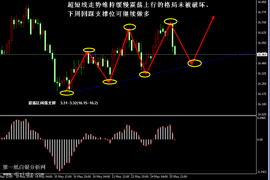 目前白銀價格是3.383克(16.464美元)。雖然本周五白銀價格大幅下跌,但整周銀價仍表現多頭占優,目前行情依靠支撐位形成連續反彈的態勢,走勢依舊處于震蕩區間內波動,且超短線的反彈形態并未遭到破壞,下周銀價繼續向上沖擊阻力的概率仍然較大。如下圖所示為白銀4小時周期走勢圖,從超短線形態來看,即使本周五銀價出現較大回落,但白銀仍然保持了良好的反彈格局。圖中紅色箭頭所示為當前超短線銀價的上升浪型,其中黃色圈所示的高點和低點正逐漸抬升,這符合上漲趨勢的特征,但由于抬升幅度較為緩慢,因此僅可定義當前銀價正處于“緩慢的反彈格局下運行”。圖中藍線所示為連接超短線幾次回踩低點形成的趨勢線,顯然下周銀價向下再次回踩趨勢線的概率較大,投資者亦應該靠近趨勢線支撐的3.36(16.4)附近補倉多單,其次若繼續回落,則可在區間強支撐3.31~3.32(16.15~16.2)補倉,統一止損底部3.28(16下方)。值得注意的是,此輪反彈浪依靠的是震蕩區間強支撐3.31~3.32(16.15~16.2)而形成,依據震蕩原理,震蕩區間內的強支撐所產生的反彈,將有望朝著震蕩區間內的強阻力而運行,目前區間內強阻力位于3.5~3.53(17.05~17.2)附近,故而,后市銀價將有較大概率會沖擊此區間,而后走勢或才真正面臨較大的調整。由于當下銀價距離支撐位較勁,且短線趨勢偏向于反彈狀態,此時銀價的下跌較大概率都是行情回踩蓄力的表現,在未破壞短線反彈趨勢之前,投資者仍應保持先低吸的思路為主,后市走勢觸及區間強阻力后,可嘗試反手高拋做空。綜合分析,下周白銀繼續在震蕩區間內運行的概率較大,投資者需密切關注下圖所示的緩慢反彈形態的延續。若依靠該反彈浪型而波動,則下周走勢將有較大概率去考驗3.5~3.53(17.05~17.2)的區間阻力帶,一旦銀價觸及此處,則此輪震蕩區間內的低吸為主的策略將轉為高拋為主的策略。直至最終走勢突破大區間3.28~3.56(16~17.35)后,行情將確認方向選擇,在突破之前,投資者可持續在區間內強支撐和強阻力進行來回高拋低吸。(注: 由于紙白銀價格是國 際銀價換算而來,而換算過程中涉及到人民幣對美元匯率的變化,即使在國際銀價不變化的情 況下,如果人民幣貶值或升值,也會導致紙白銀價格出現變動。因此,我們的分析只采用最新 的國際銀價對應的人民幣白銀價格,如與過去分析價格有出入, 投資者應知曉其原因。)