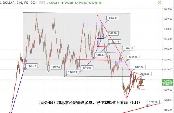 美聯儲加息在即,而以往加息前的下跌在本輪行情中則維持億1301為壓制,1290位支撐的寬幅震蕩格局而替代,6月加息已無懸念,9月和12月加息的預期也在逐步升溫之中,加息靴子落地買事實的行情或將再度呈現,而加息臨近前預計寬幅震蕩將加劇,其目的主要是主力洗盤的陰謀!而技術面短線1301的壓制依然是重點,企穩1301后再考慮看多的格調,下方1292和1290的支撐再度觸及破位的概率加大,所以暫時不建議盲目抄底!