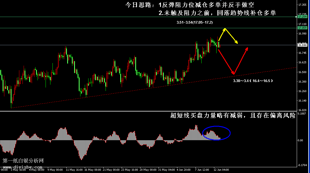 今日下方關鍵支撐3.38~3.4(16.4~16.5)、3.31~3.33(16.1~16.2)、3.29(16);今日上方關鍵阻3.51~3.54(17.05~17.2)、3.57(17.35)。 提示:技術僅僅是基于概率論和統計學的一種綜合分析手段,絕非預測。所以技術分析是在考慮做好止損的情況下去博取大概率事件,投資不可過于迷信技術分析。(短線操作請一定做好止損,一旦被損,代表分析師基于概率和統計的技術分析不適用于當前行情) 另外,由于紙白銀價格是國際銀價換算而來,而換算過程中涉及到人民幣對美元匯率的變化,即使在國際銀價不變化的情況下,如果人民幣貶值或升值,也會導致紙白銀價格出現變動。因此,我們的分析只采用最新的國際銀價對應的人民幣白銀價格,如與過去分析價格有出入, 投資者應知曉其原因。 1、文中價格為紙白銀價格,括號內為國際銀價,投資者可雙向參考。 2、以上所有價格為工商銀行買入價,即紙白銀低價。進倉點位要再加點差(各銀行點差不一),出倉則不要。 3、第一紙白銀給出的所有建議僅供投資者參考,不作為下單絕對依據,切勿過于依賴。 4、北京時間09:00發布此文章。 5、上一交易日白銀價格分析情況:(6月12日)白銀多頭強勁繼續拉升 關注強壓回落風險